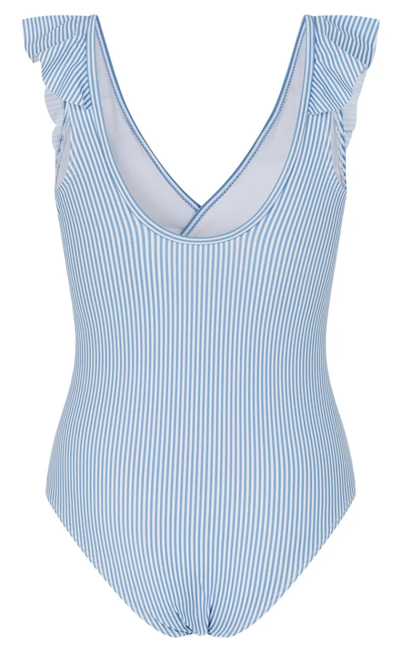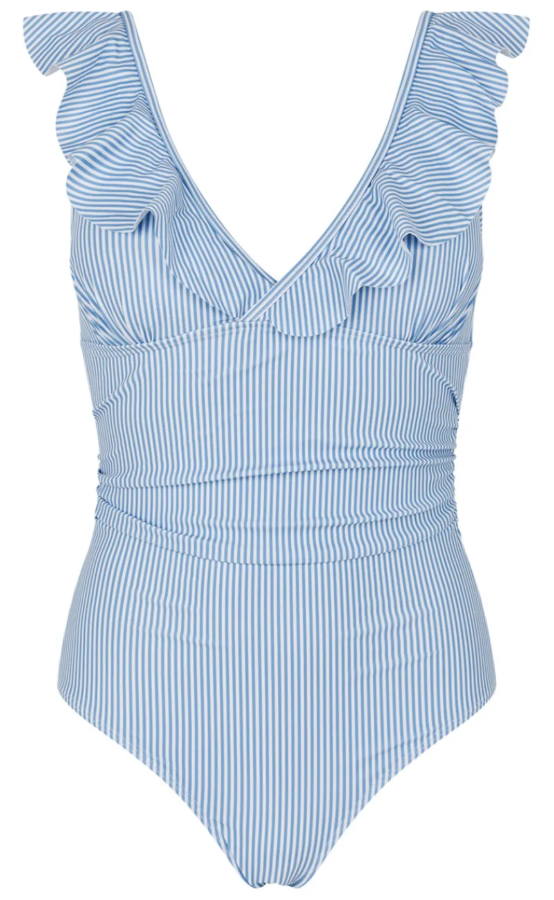 Blåstribet badedragt med de fineste flæse detaljer ved brystet og perfekt pasform