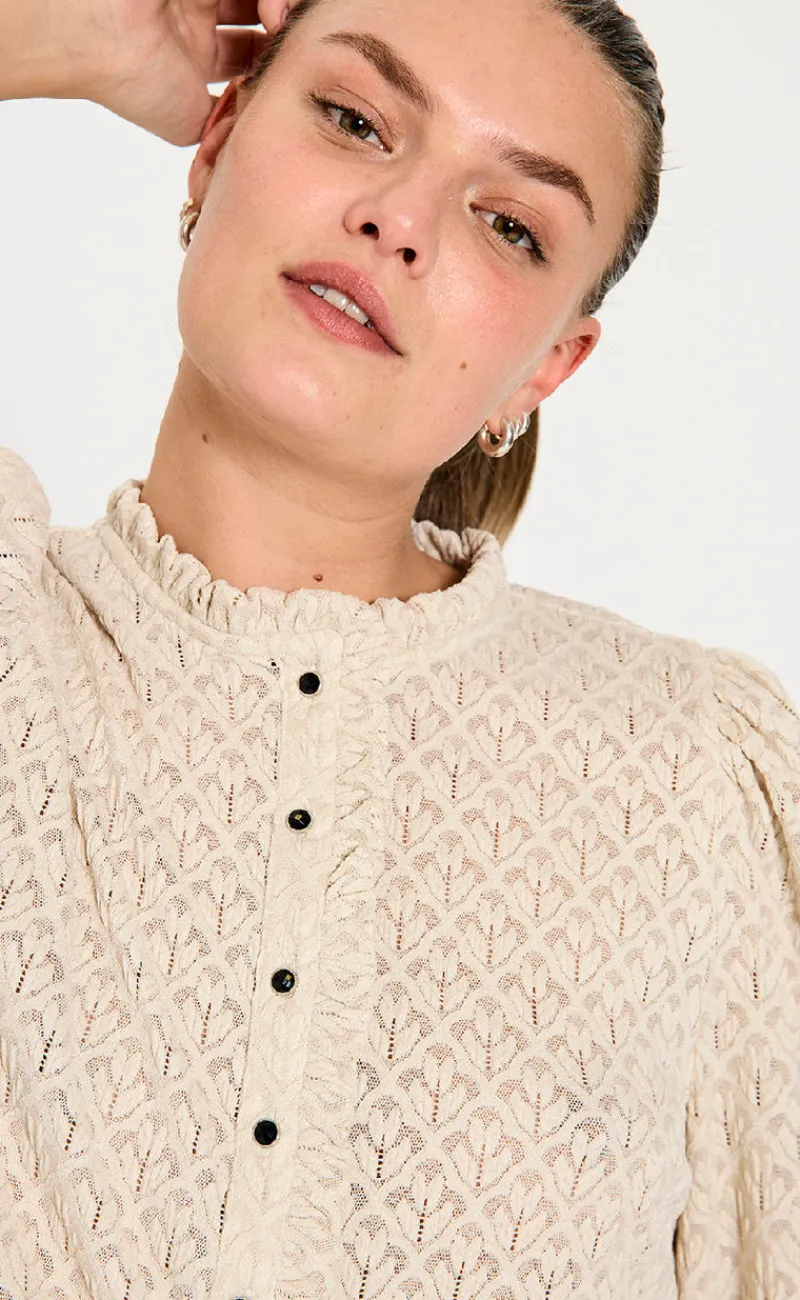 Blusen har lange ærmer, en smule puf i ærmet samt en knaplukning