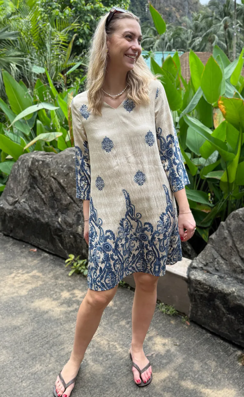 Fin kjole fra INA Copenhagen i creme med paisley print i blå nuancer.