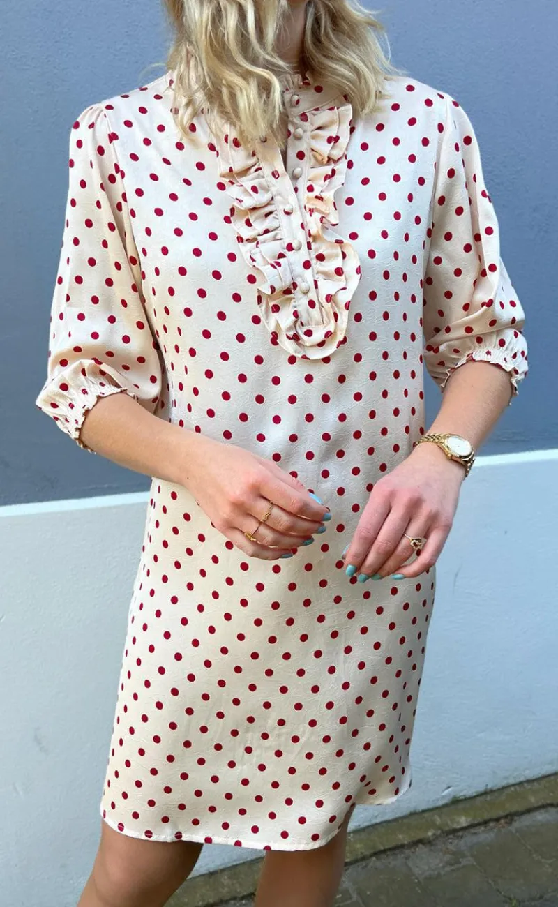 Smuk kjole fra INA Copenhagen med en beige baggrund og røde prikker. Kjolen har de fineste flæser fortil.