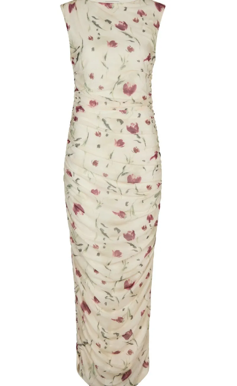 Maxi mesh kjole fra Neo Noir med rynk ned langs sidesømmen og et blomstret print.