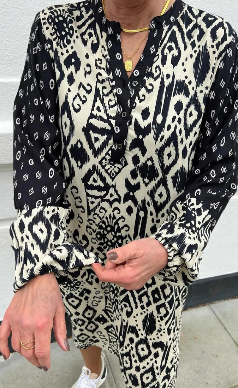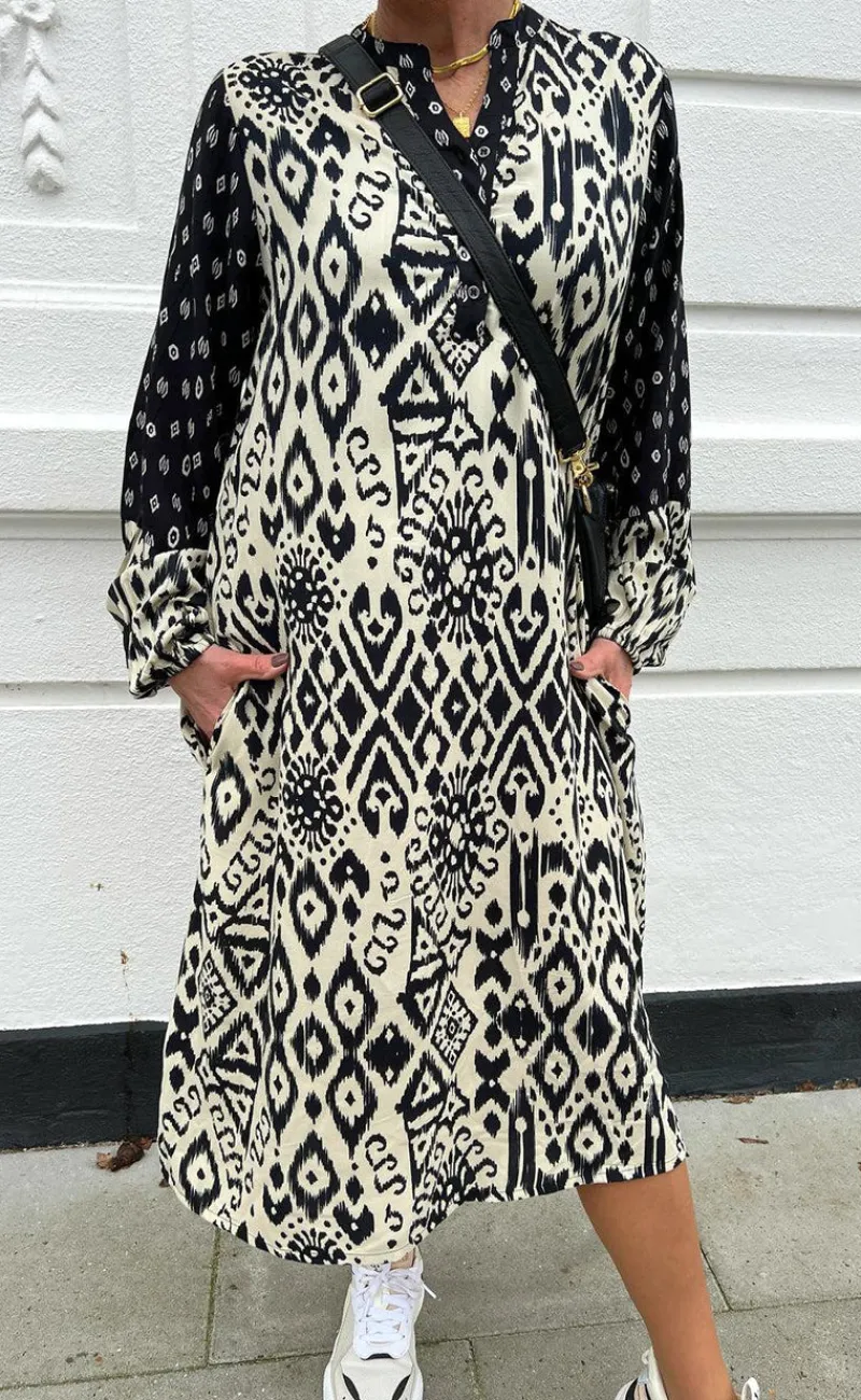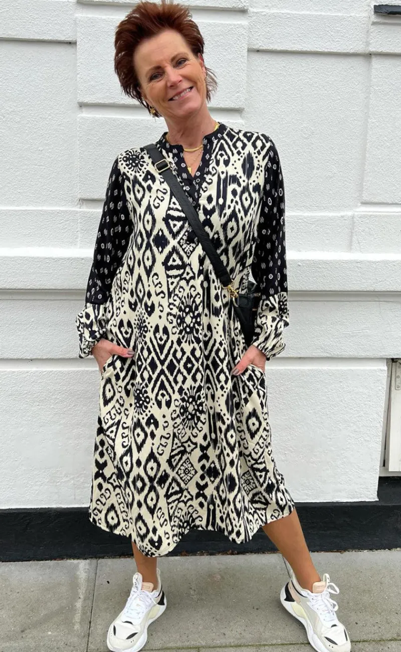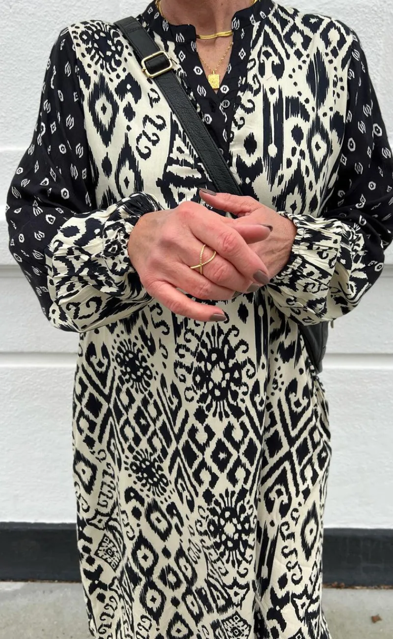 Flot kjole kjole fra INA Copenhagen med print i sort og off-white.