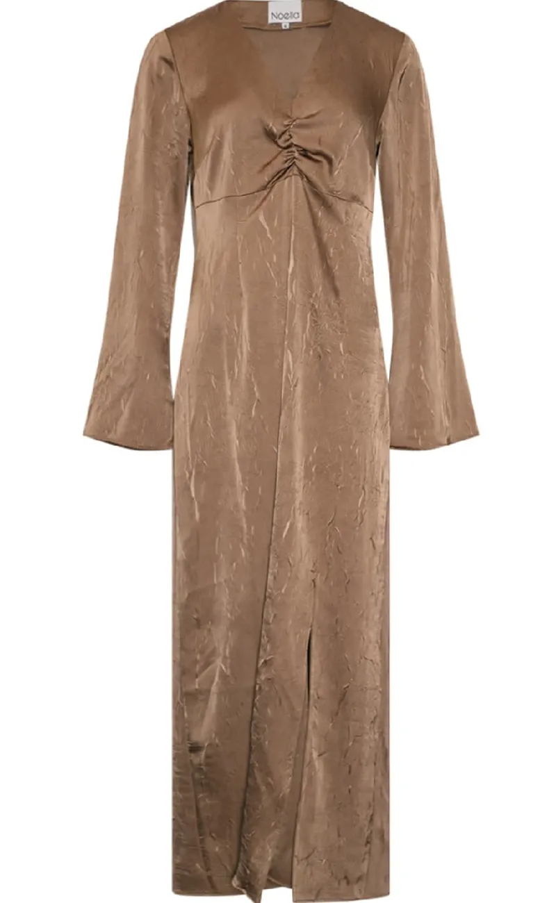 Kjolen har lange ærmer, en slids ved benet og en fremhævet talje.