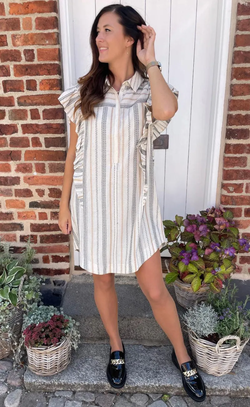 Kjolen er knappet hen over brystet, har flotte flæsedetaljer ved ærmerne og en klassisk krave.