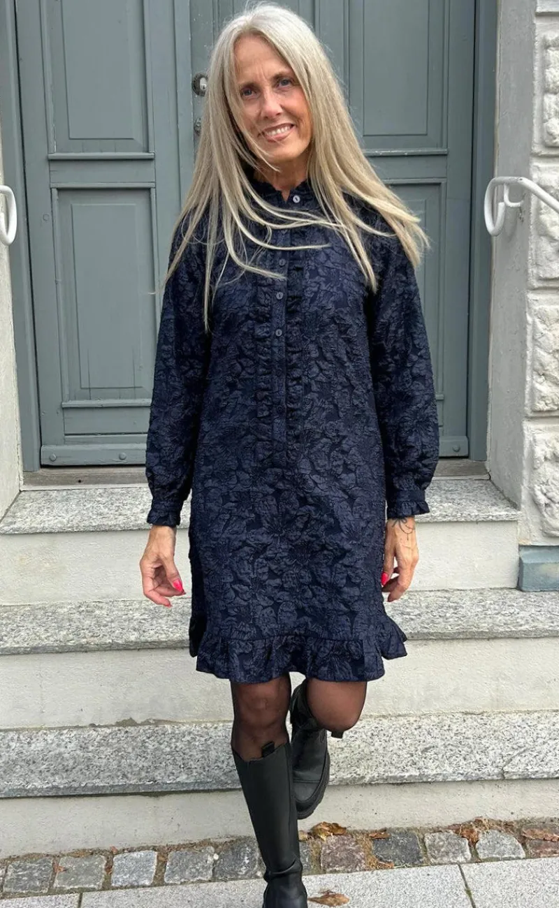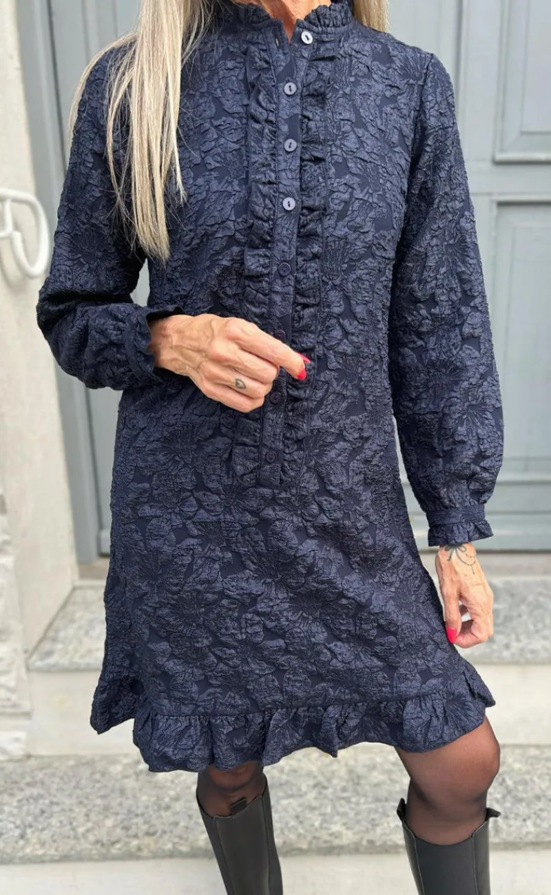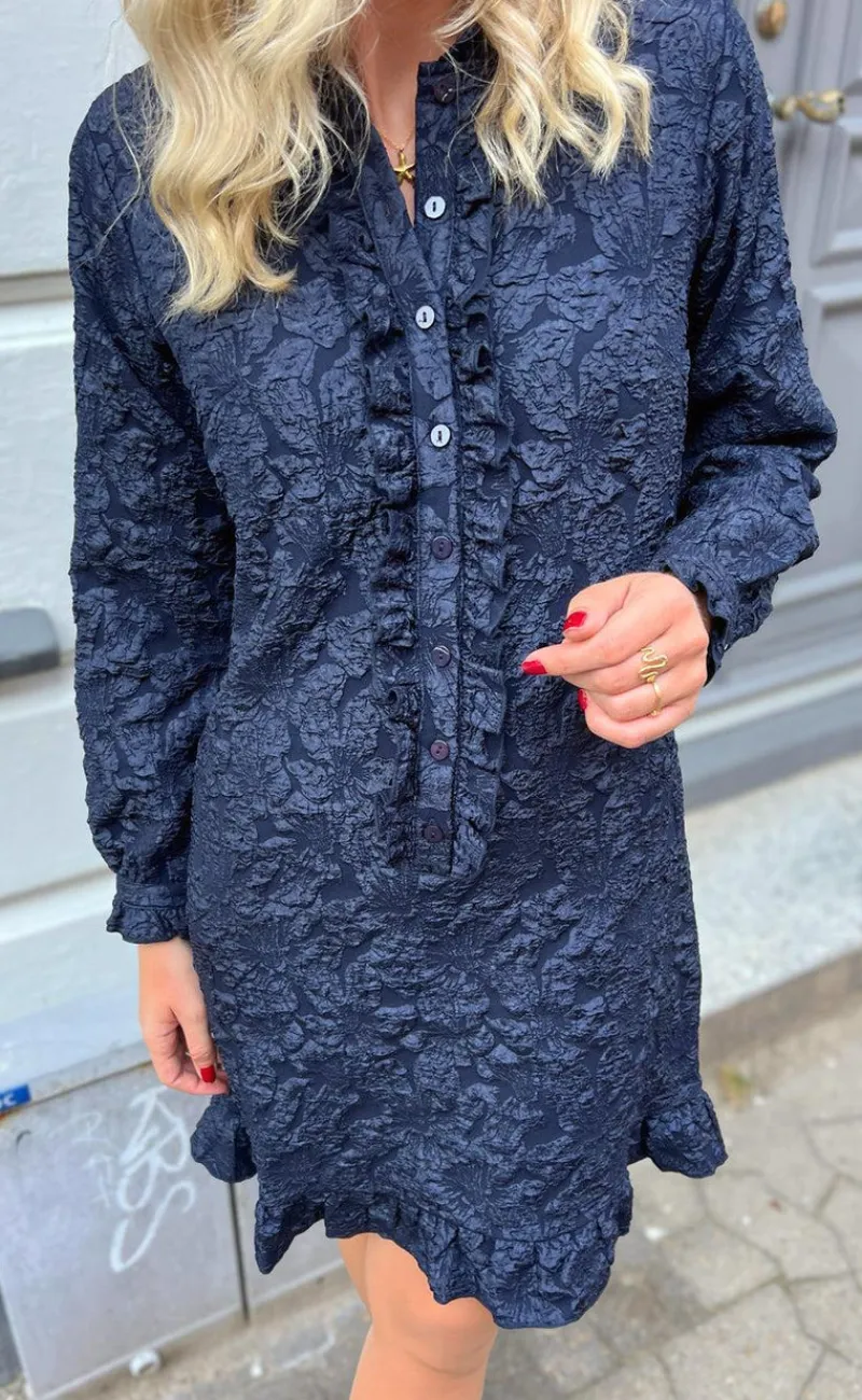 Eksklusiv kjole fra INA Copenhagen i navy blå med et 3D-blomsterprint med stræk i materialet.