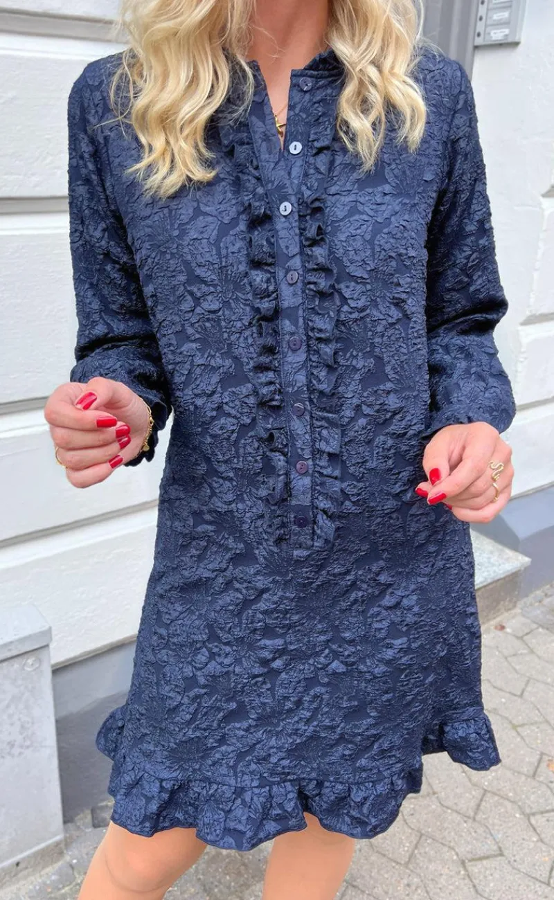 Kjolen har en åbning med knapper og de fineste flæser langs brystet. Kjolen har lange ærmer og en fin flæsekant nederst på kjolen.