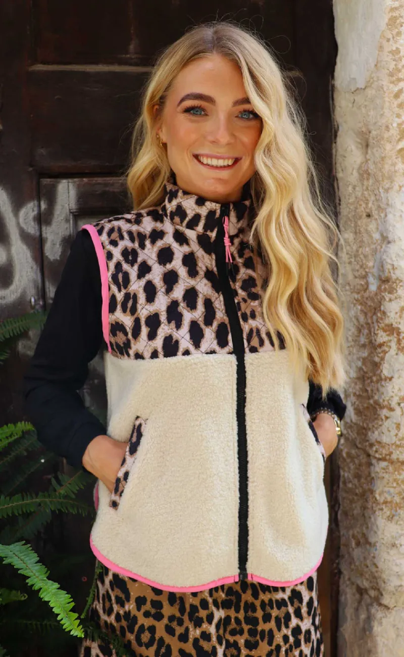 Teddo vest fra Liberte i beige, med leopardprint i toppen og lyserøde syninger.