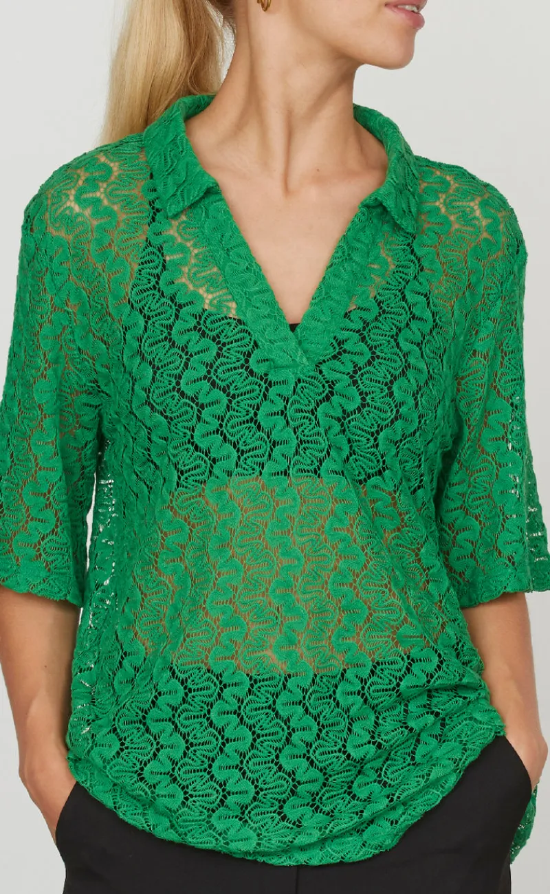 Grøn bluse fra Love & Divine i en let gennemsigtig kvalitet.