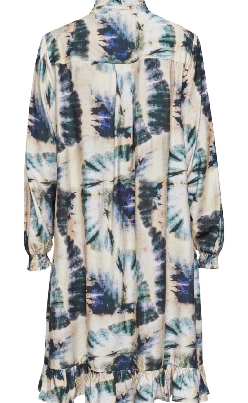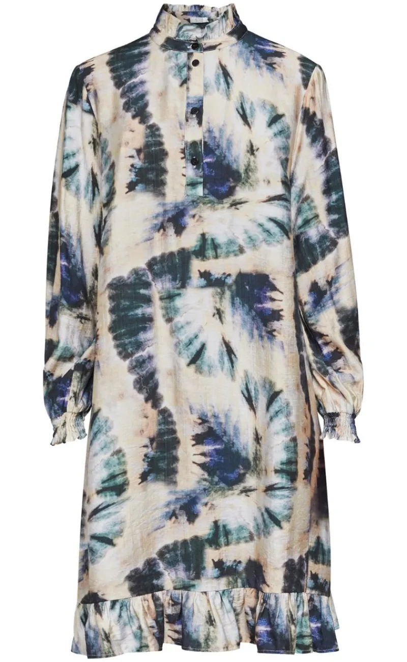 Flot mellemlang kjole i blålige nuancer.