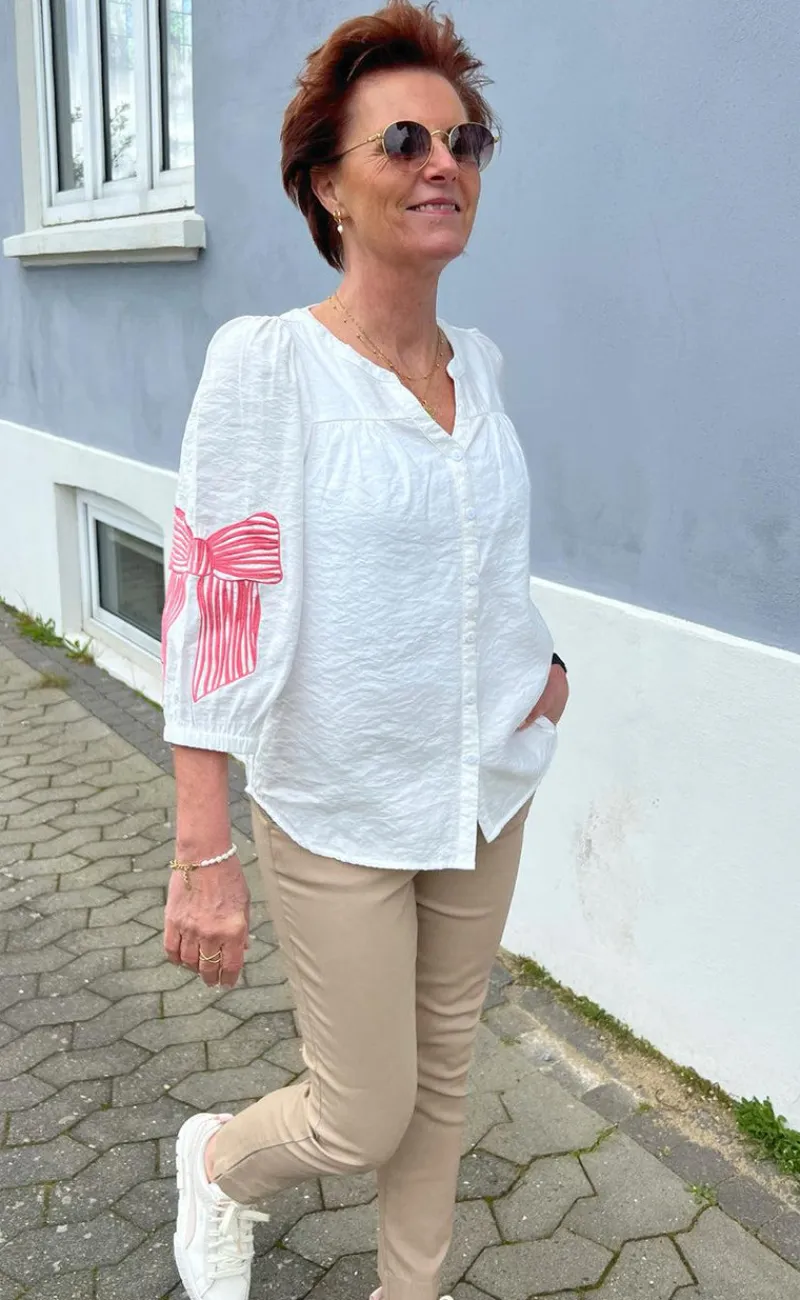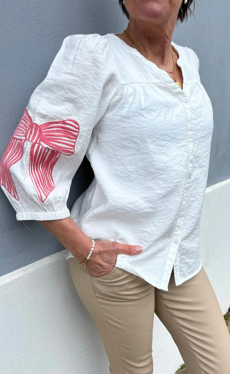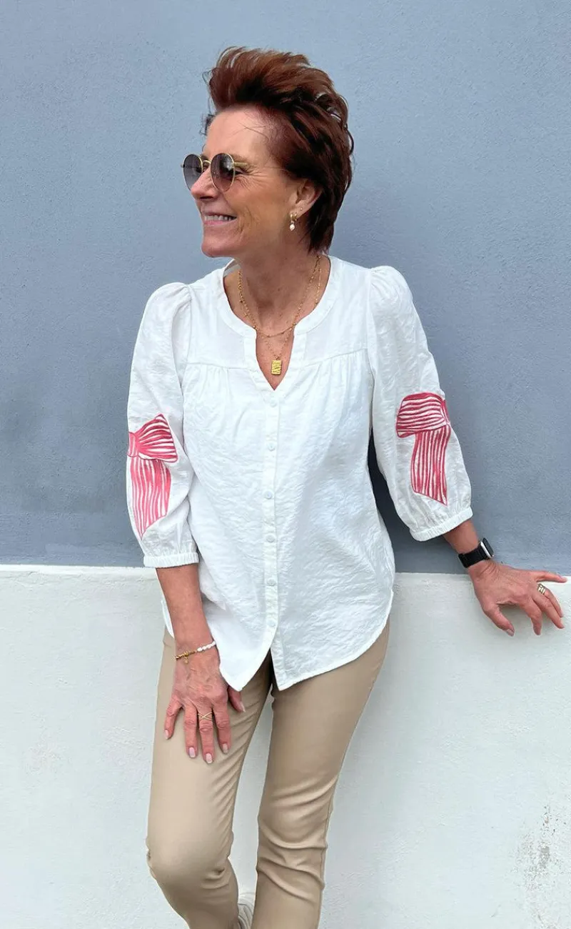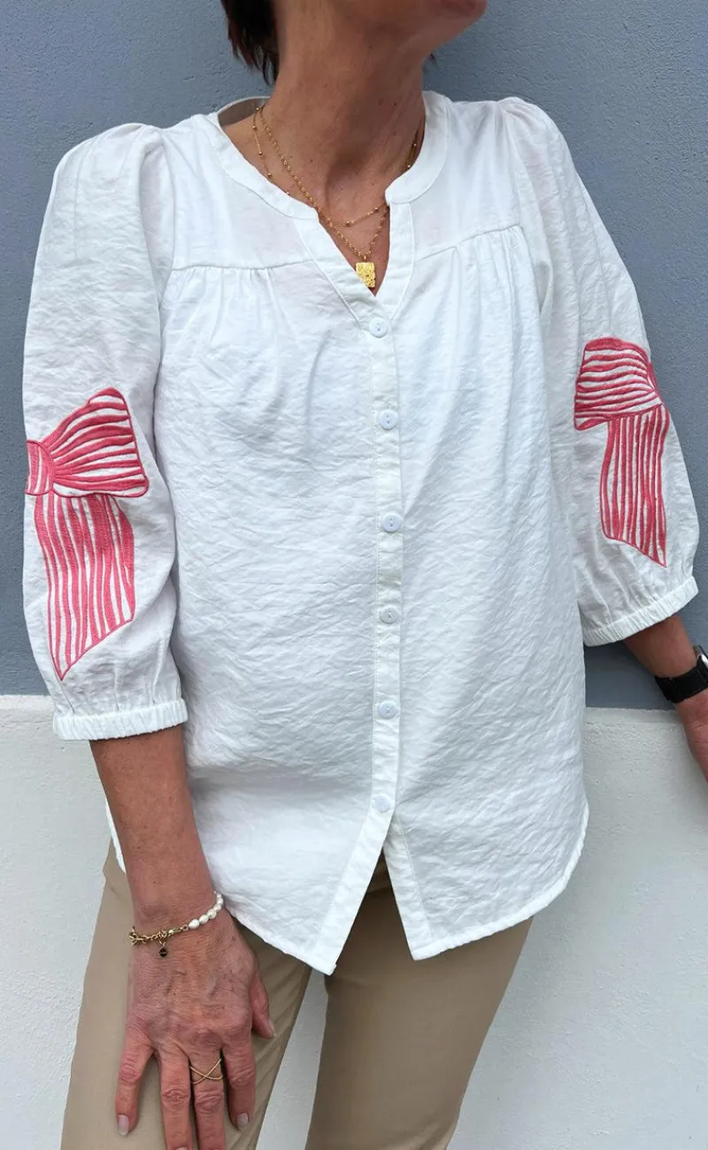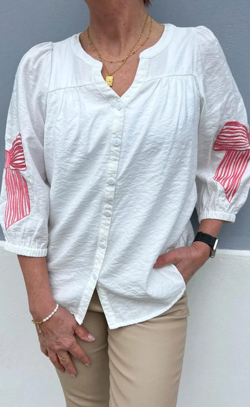 Den fineste skjorte fra INA Copenhagen i hvid med en broderet sløje på hvert ærme i pink.