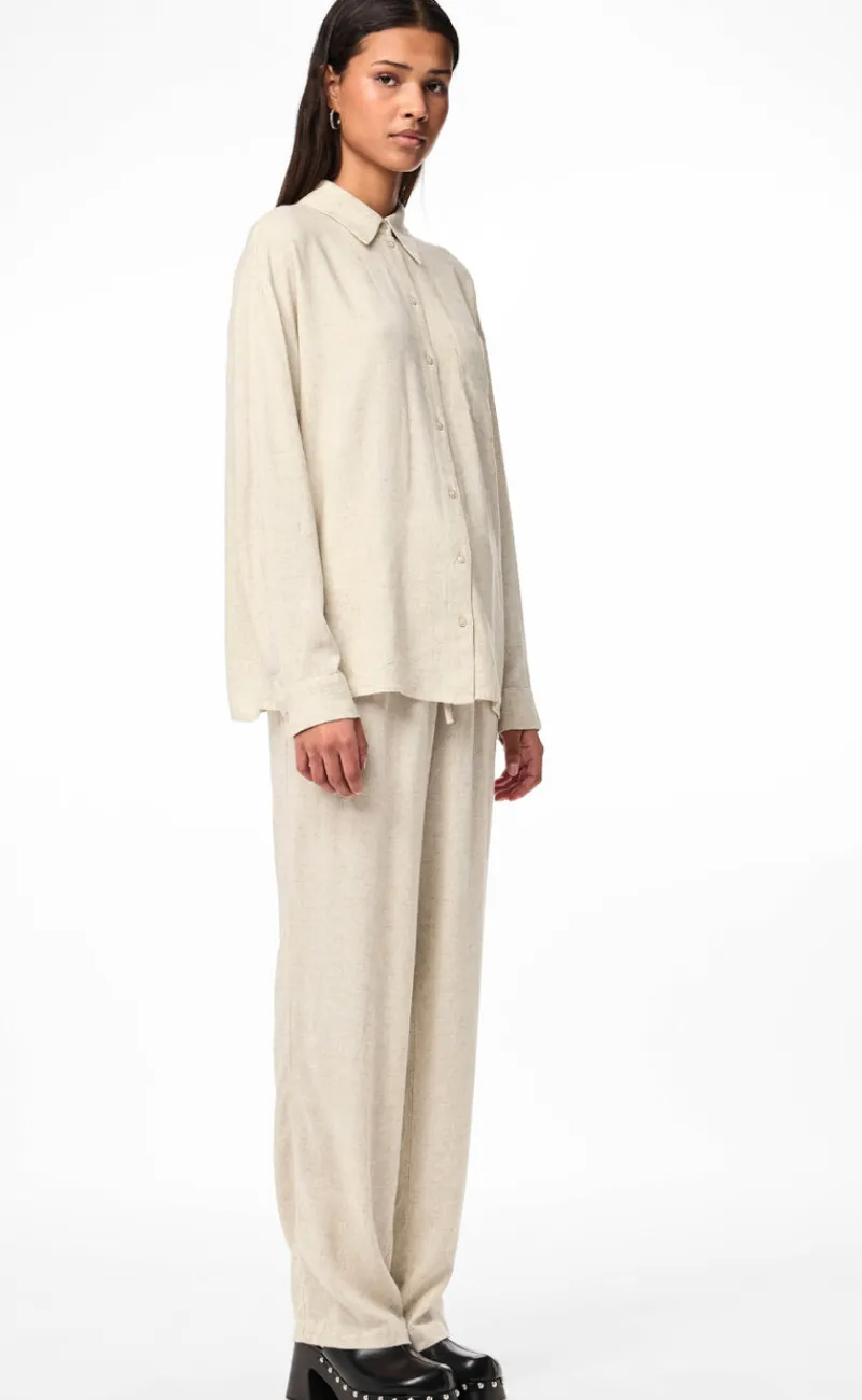 Skjorten har lange ærmer, er gennemknappet samt har en enkelt brystlomme.