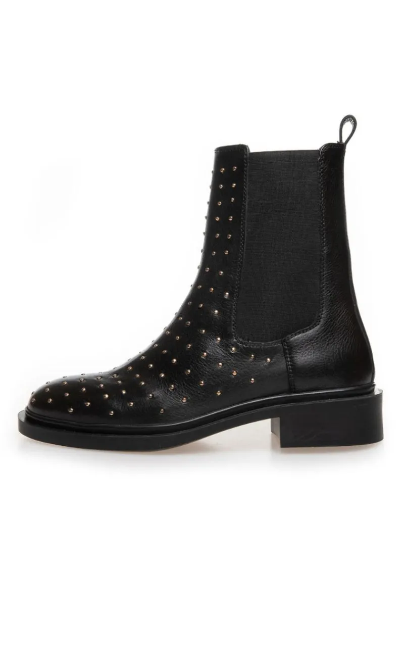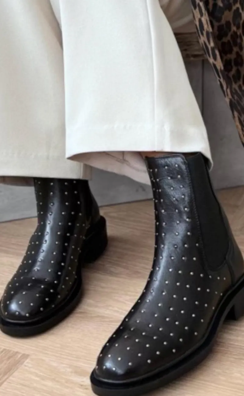 Støvlerne kommer i en skinnende farve og har guld nitter rundt. De har en tynd sål og elastik i siderne, som gør dem nemmere at komme i.