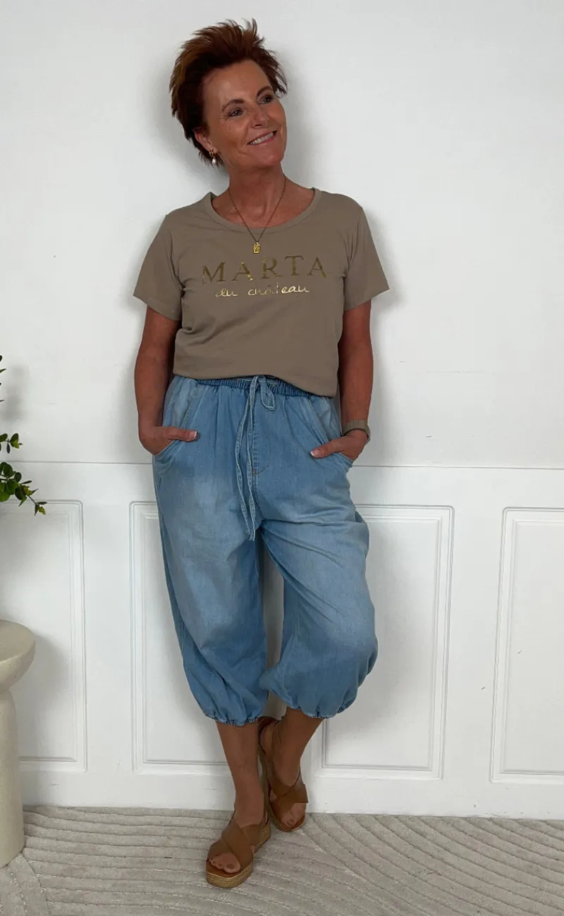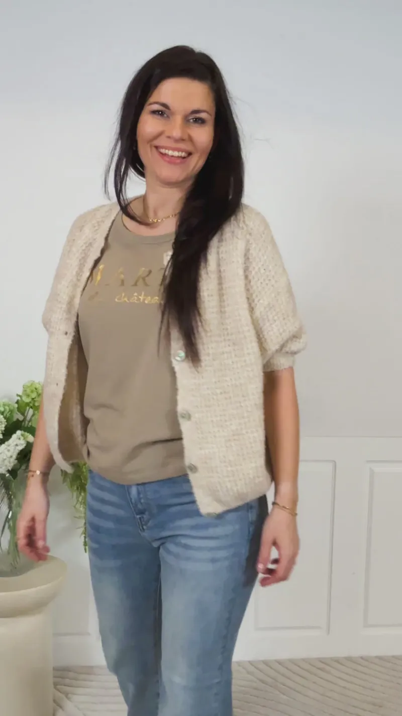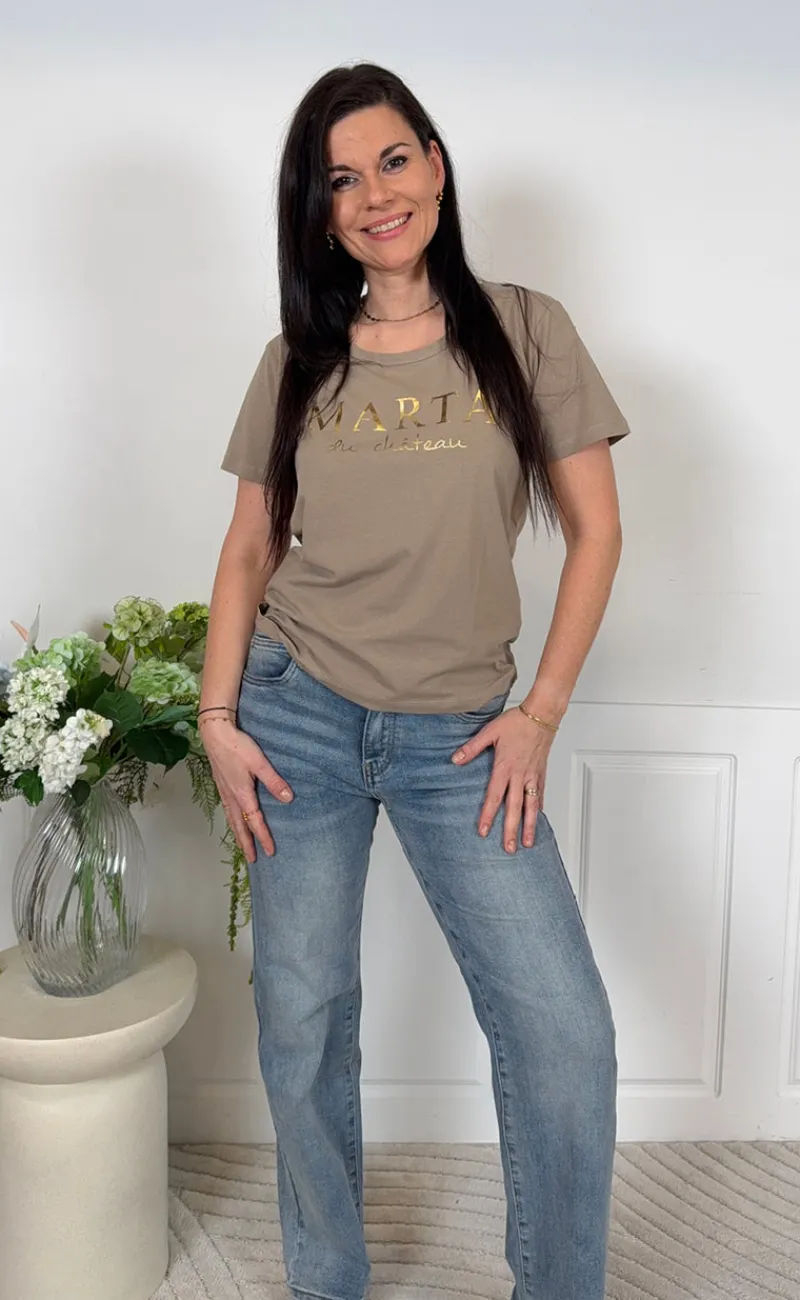 Sød t-shirt fra Marta Du Chateau i beige, med guld skrift på brystet.
