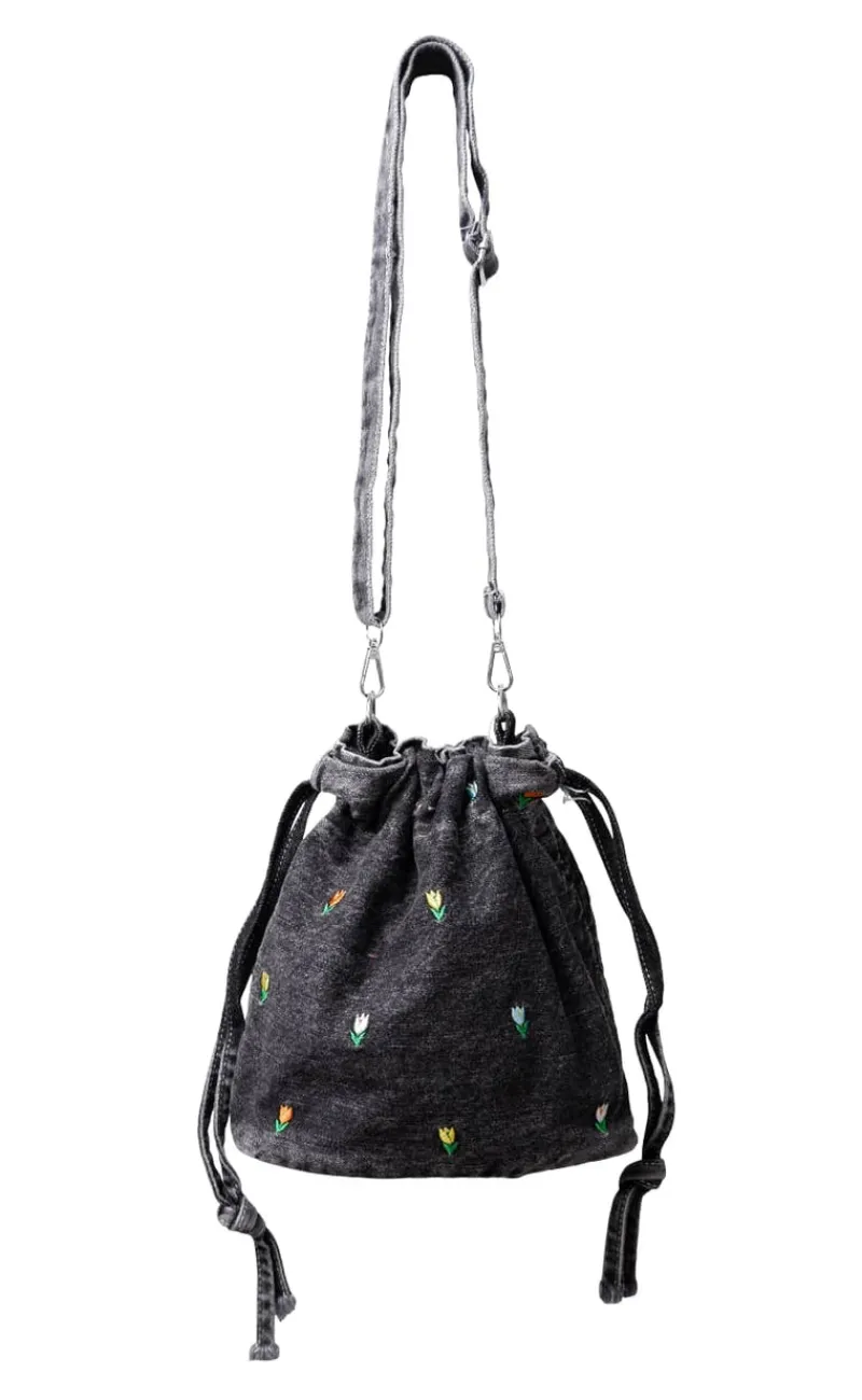Cool og lille taske fra Black Colour i en denim kvalitet, med broderede tulipan blomster.