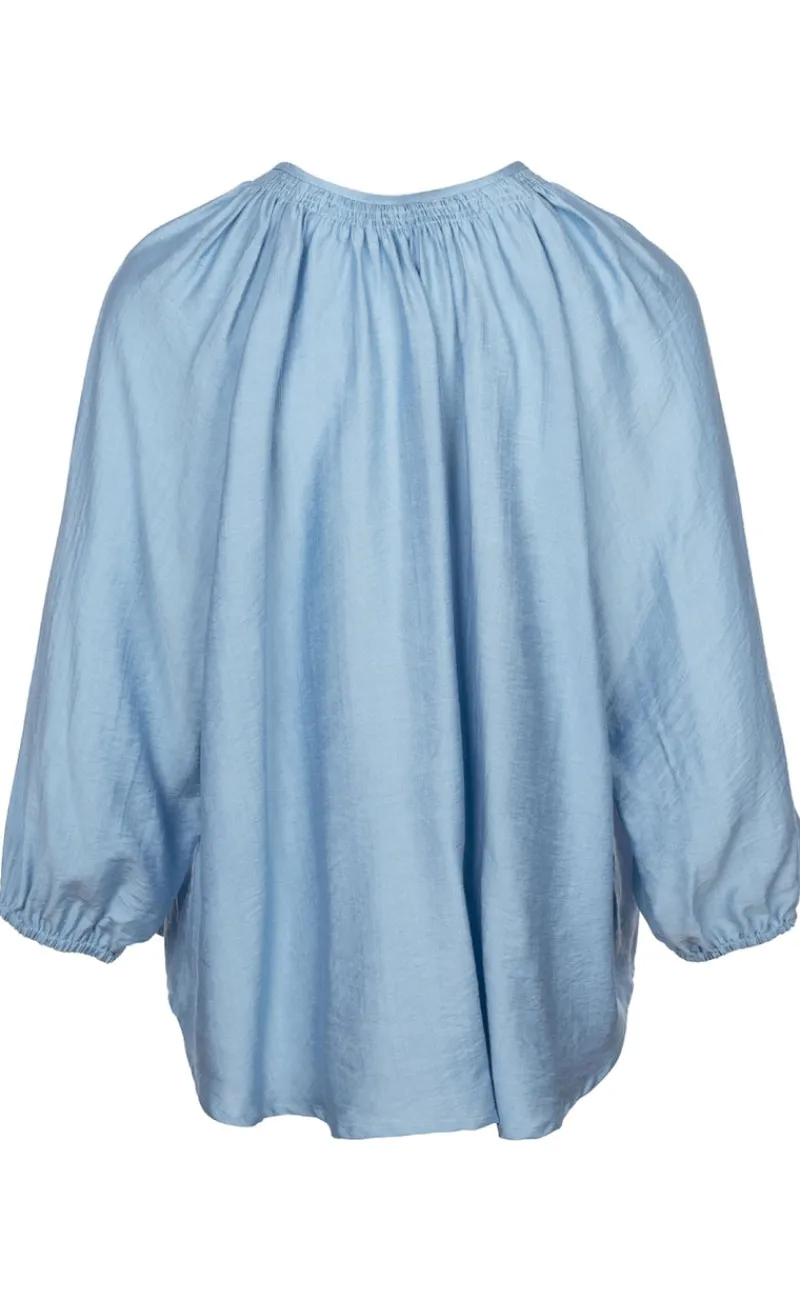 Blusen har en løs pasform og snørelukning ved halsen.