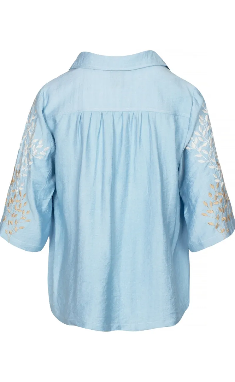 Blusen har løse ærmer og en lille v-udskæring.