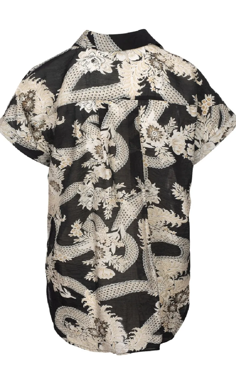 Blusen har korte ærmer og et løst fit.