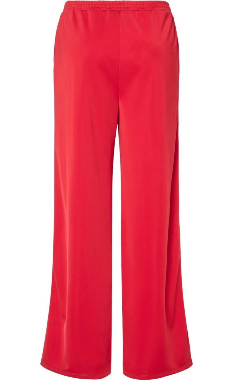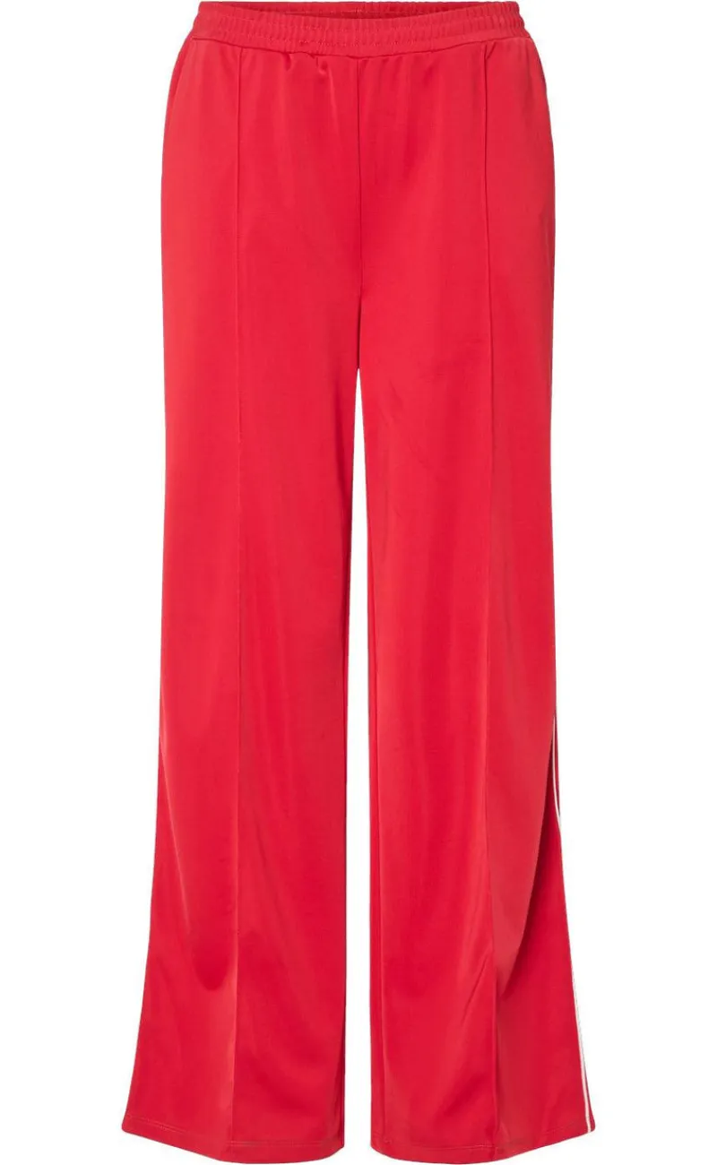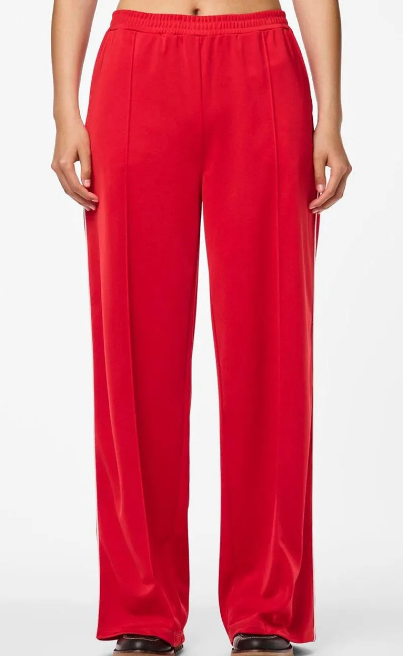Fede track bukser fra Pieces i en skarp rød med en hvid stribe på siden. Bukserne harr et afslappet fit og elastik i taljen.
