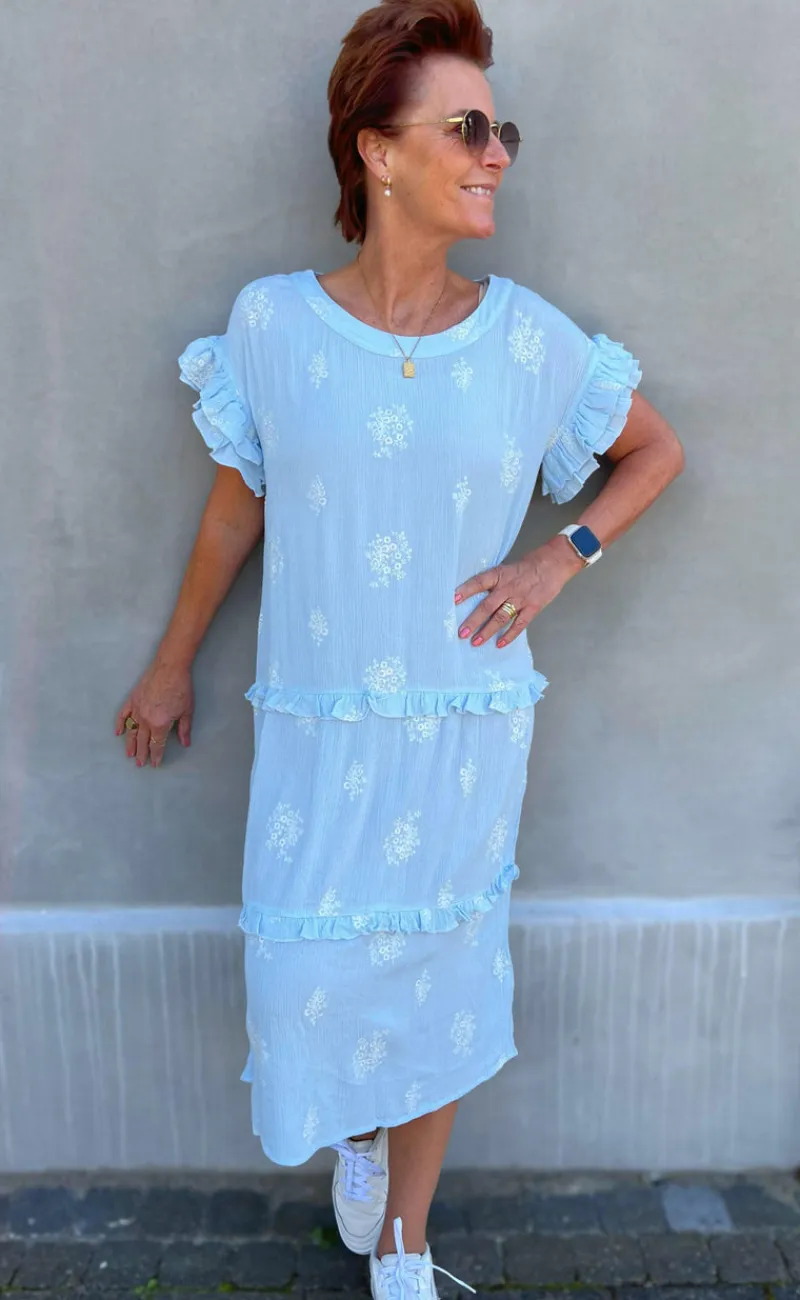 Flot kjole fra INA Copenhagen i lyseblå med broderede blomster i hvid.