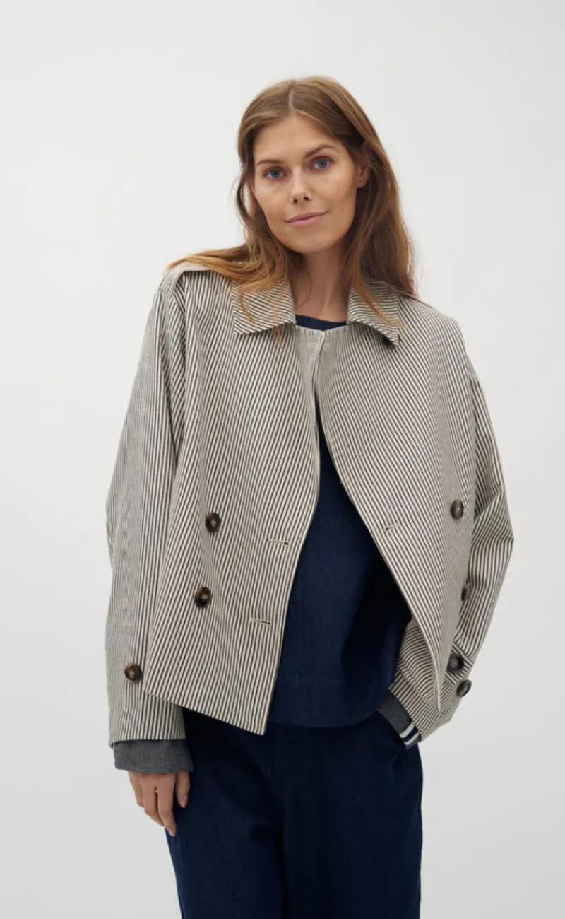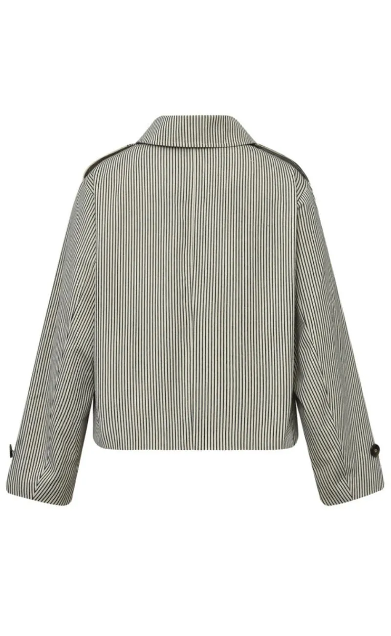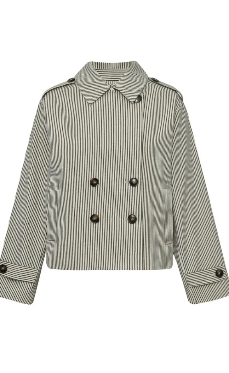 Denne jakke har striber og en masse knapper.
