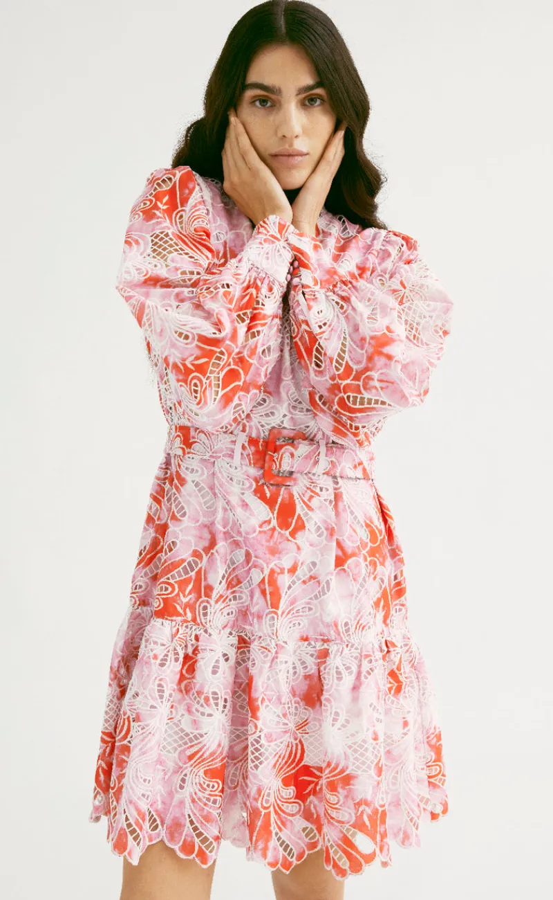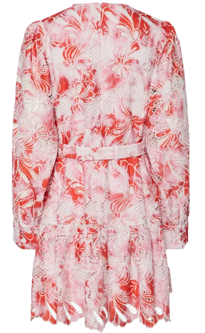 Kjolen har lange ærmer, en mini længde og et bælte i taljen.