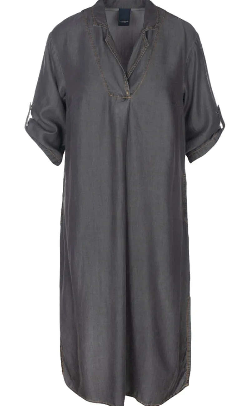 Denne kjole er i et skinnede matriale, og så har den et denim look.