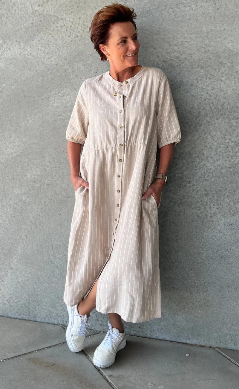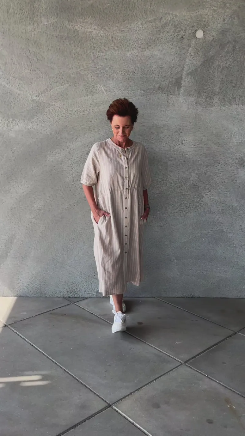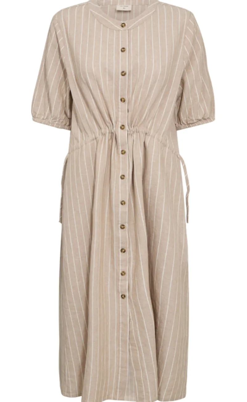 Kjolen har korte ærmer, knapper lang ned og detalje i taljen.