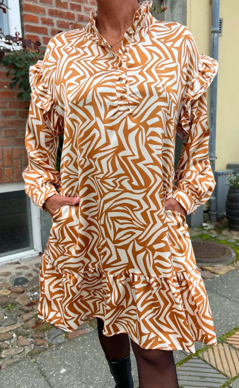 Smuk og elegant kjole fra INA Copenhagen med print i camel og beige.