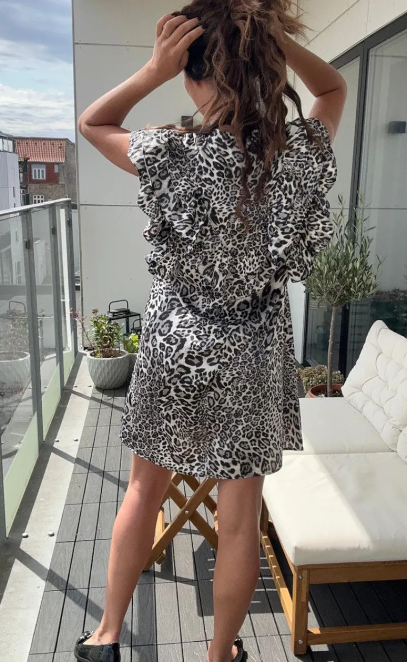 Kjolen har flæsedetaljer samt en lille v-udskæring.