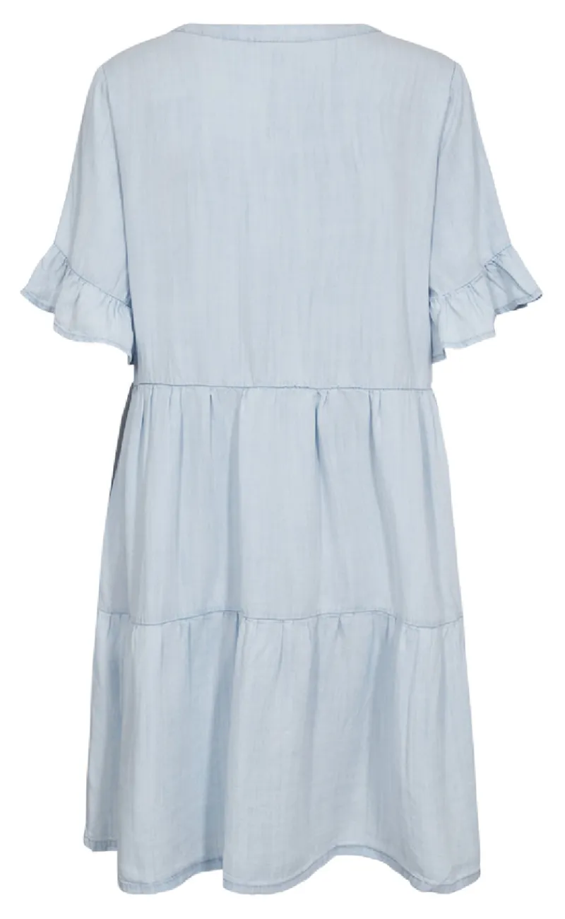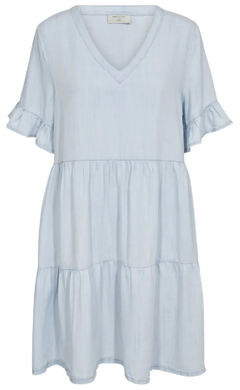 Knælang denim kjole fra Freequent i en lyseblå kvalitet.