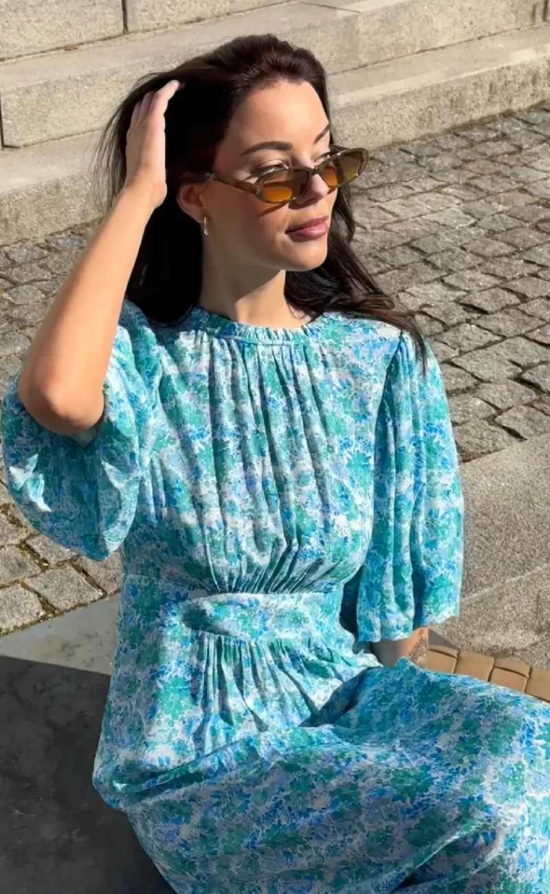 Super yndig kjole fra Noella i et blåt blomsterprint.