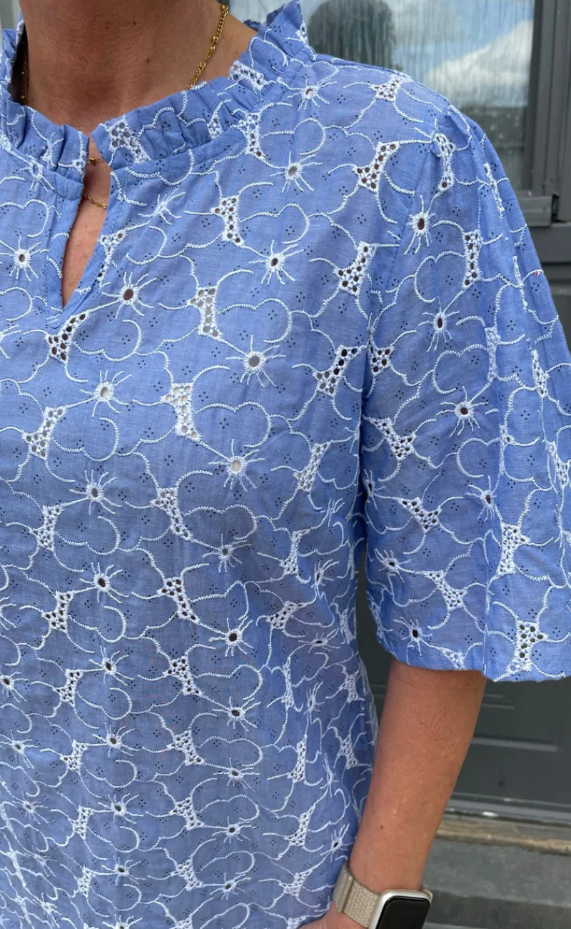 Den smukkeste kjole fra INA Copenhagen i blå med broderede blomster i hvid.