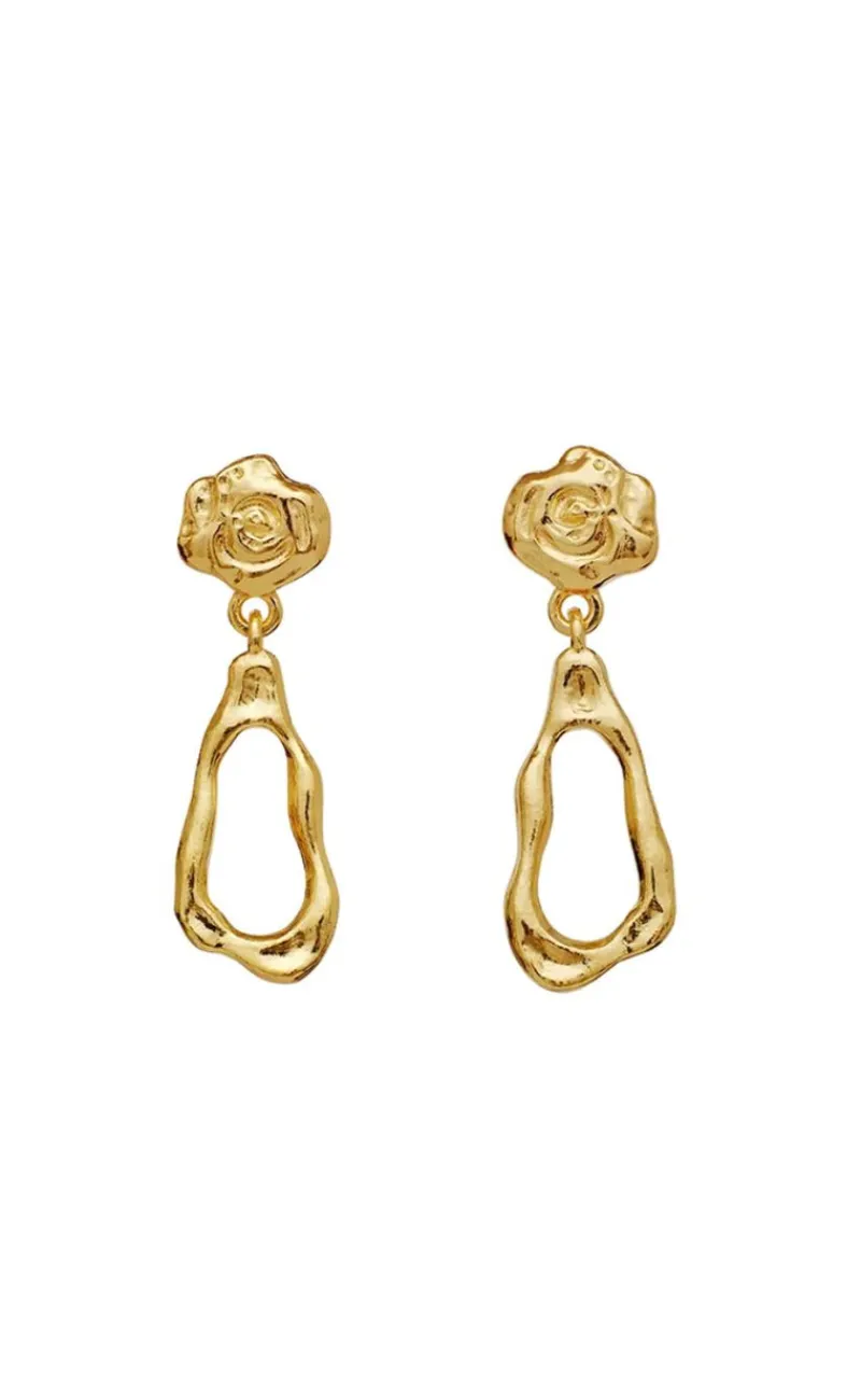 Disse øreringe hænger fra øret og har en rose i guld.