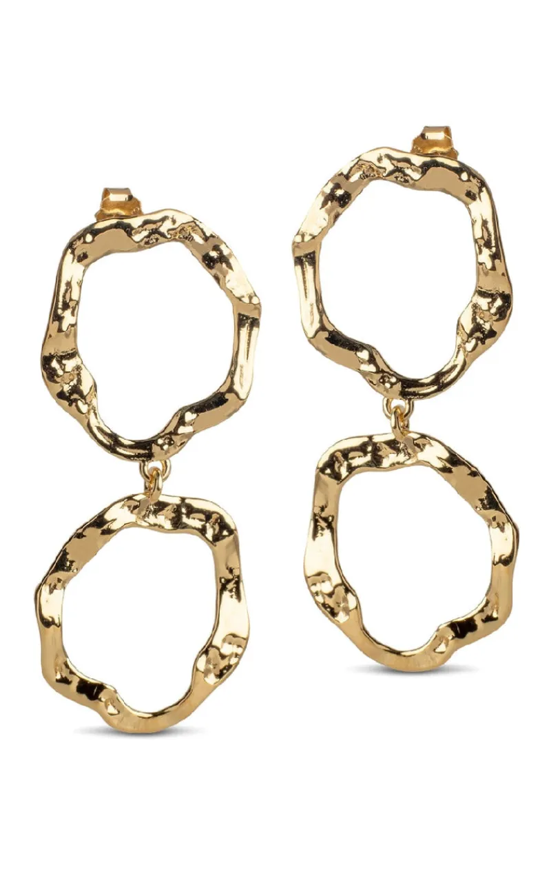 Store og fyldige øreringe fra ENAMEL Copenhagen i en guld farve, formet som to store cirkler, med et råt udtryk.