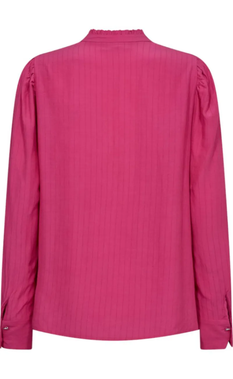 Fin Freequent skjorte i pink med diskrete nålestriber og flæsedetaljer.