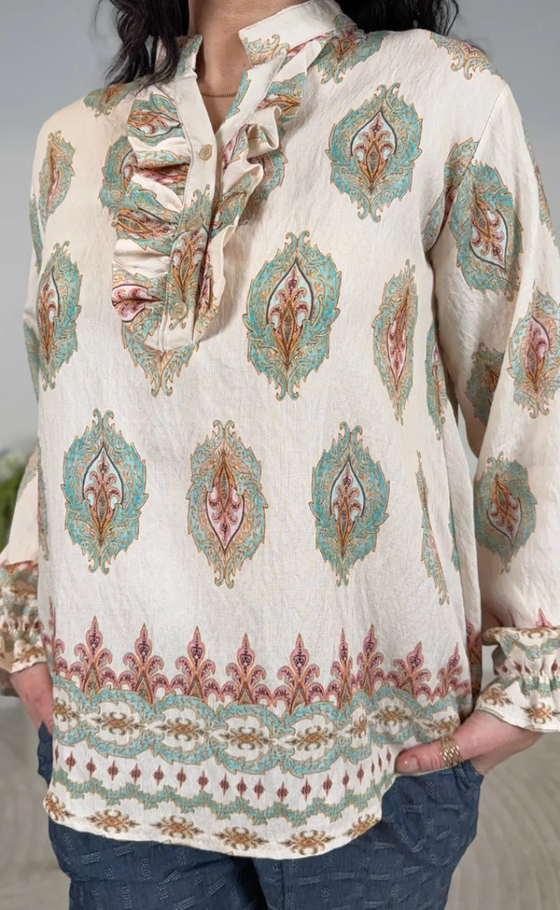 Skjorten har en knaplukning med flæsedetaljer foroven.