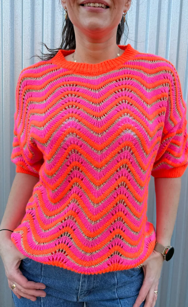Lækker strik med korte ærmer i orange, pink og guld.