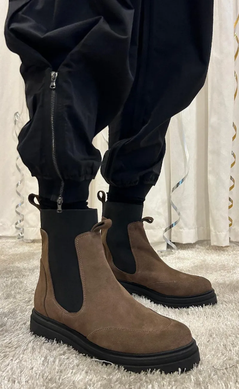 Støvle er i ruskind med elastik og gummi sål.