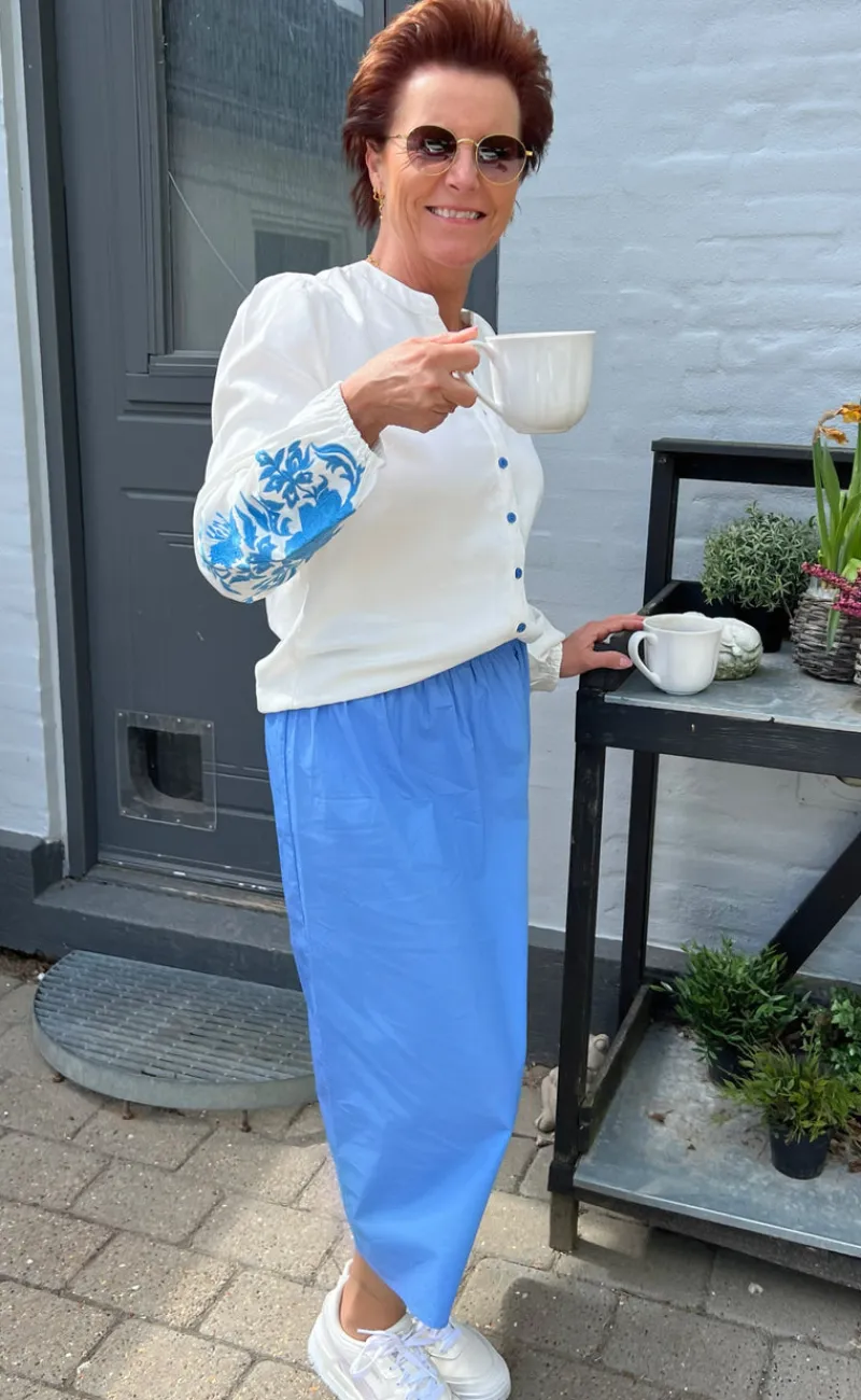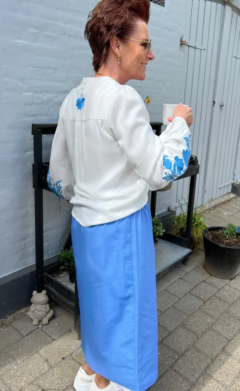 Den fineste bluse fra INA Copenhagen i hvid med broderede detaljer i blå.