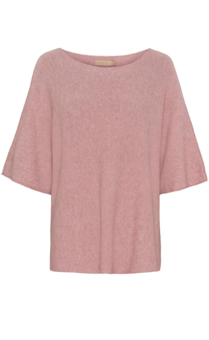 Blusen har brede ærmer, en rund hals samt en løs pasform.