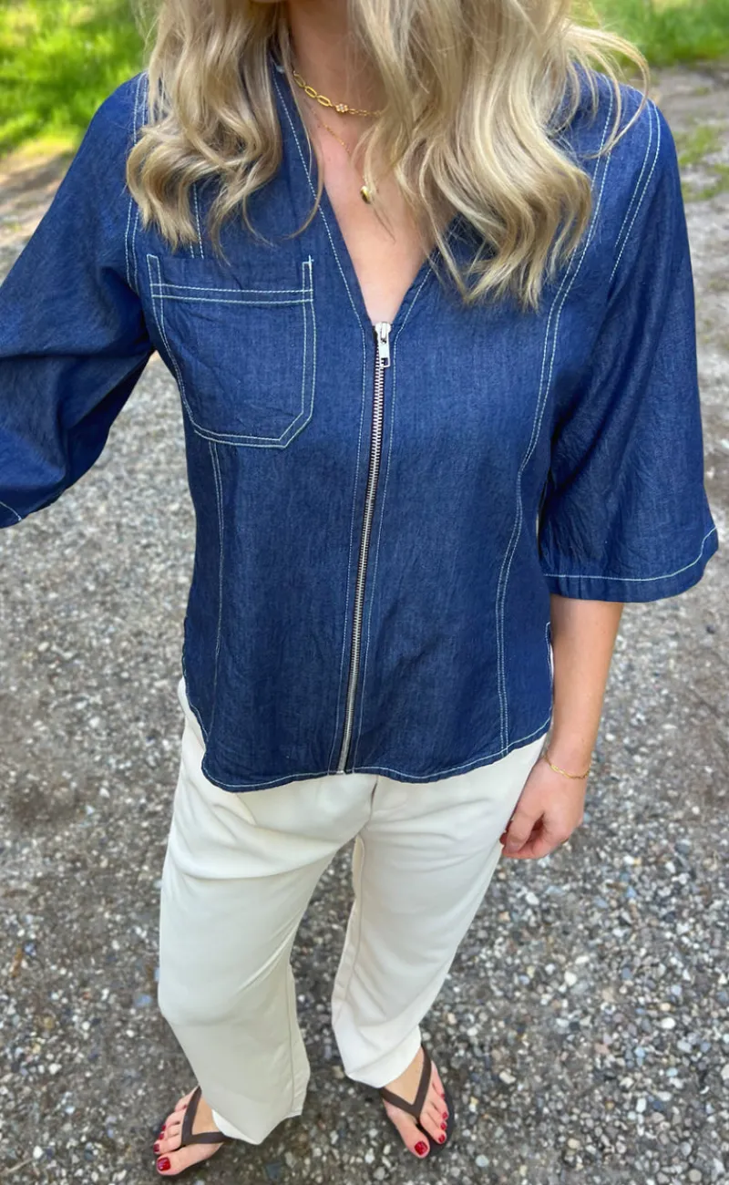 Smart bluse fra INA Copenhagen i en blå denim kvalitet med hvide syninger.