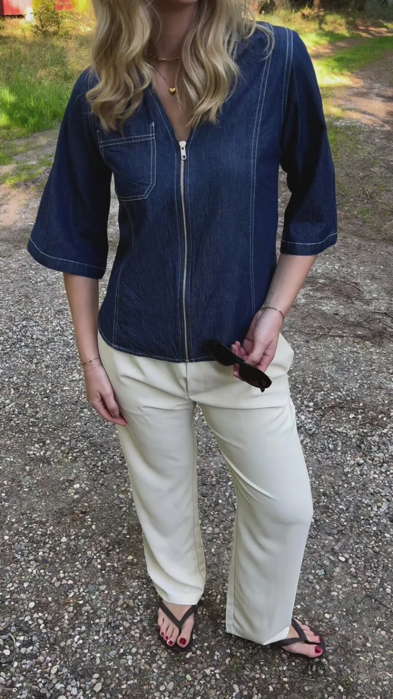 Blusen har brede 3/4 ærmer, åbnes med lynlås på fronten og har en brystlomme.