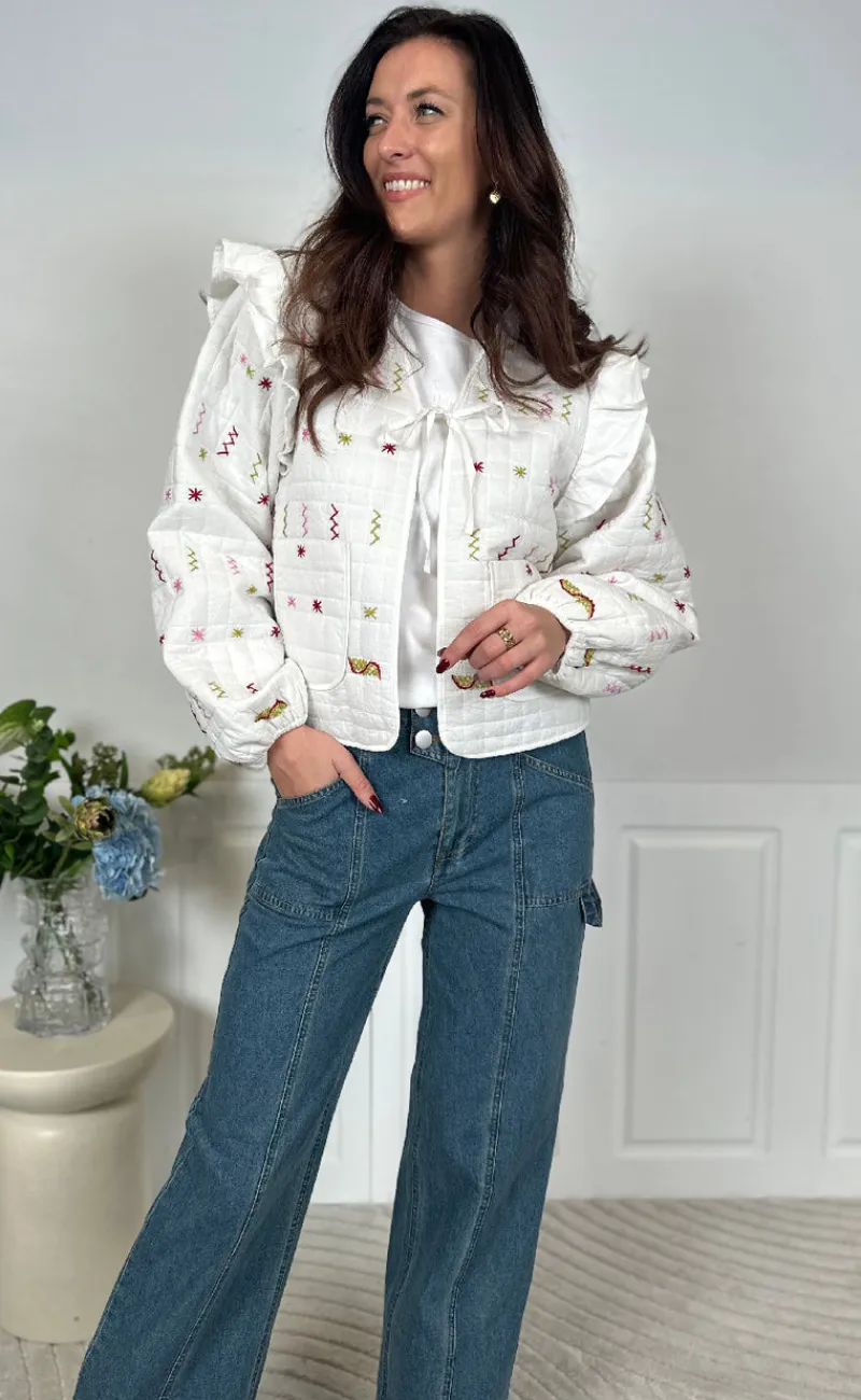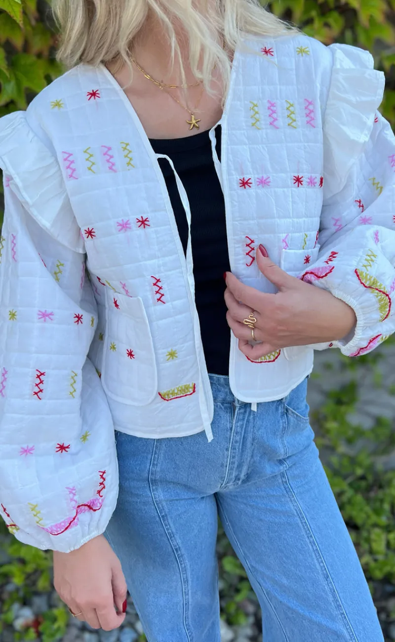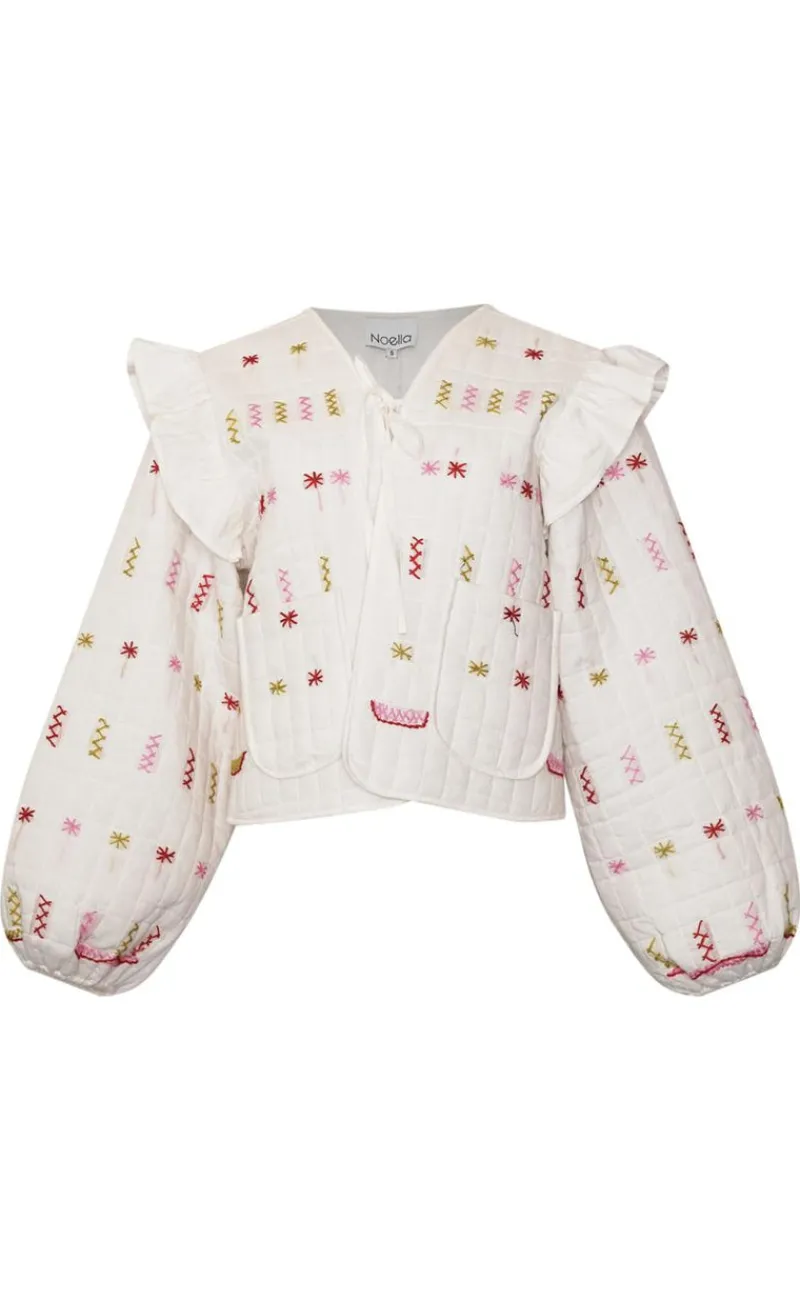 Jakken har frynser ved ærmet, bindebånd og puffærmer.