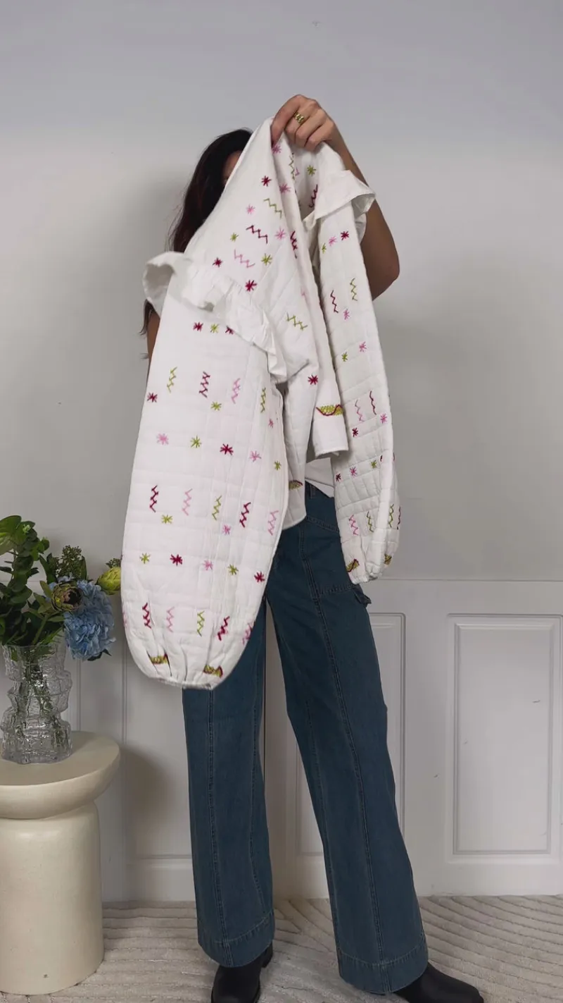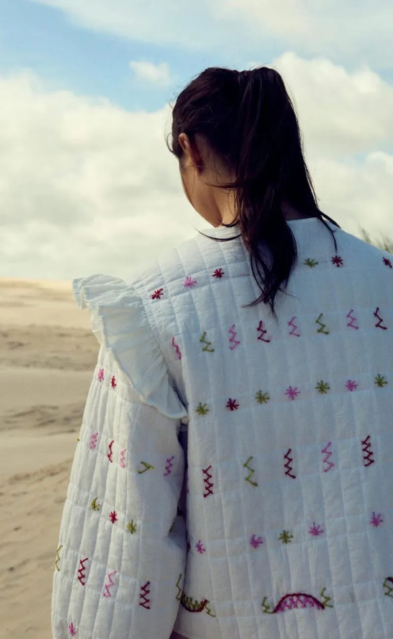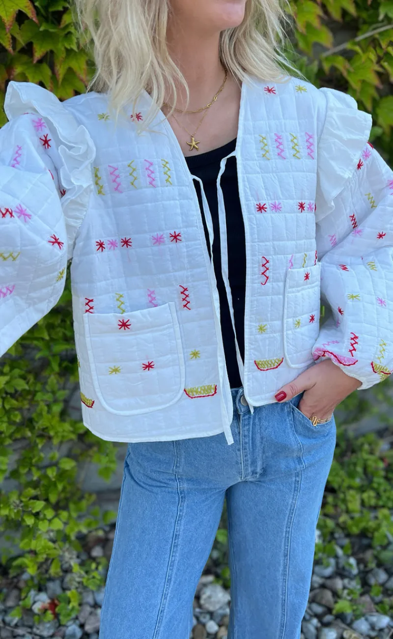 Jakken har frynser ved ærmet, bindebånd og puffærmer.