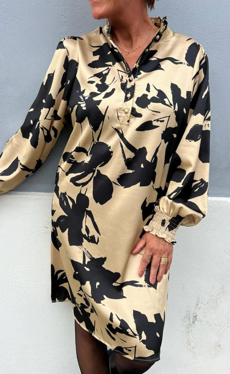 Smuk kjole fra INA Copenhagen i en camel nuance med sorte blomster.