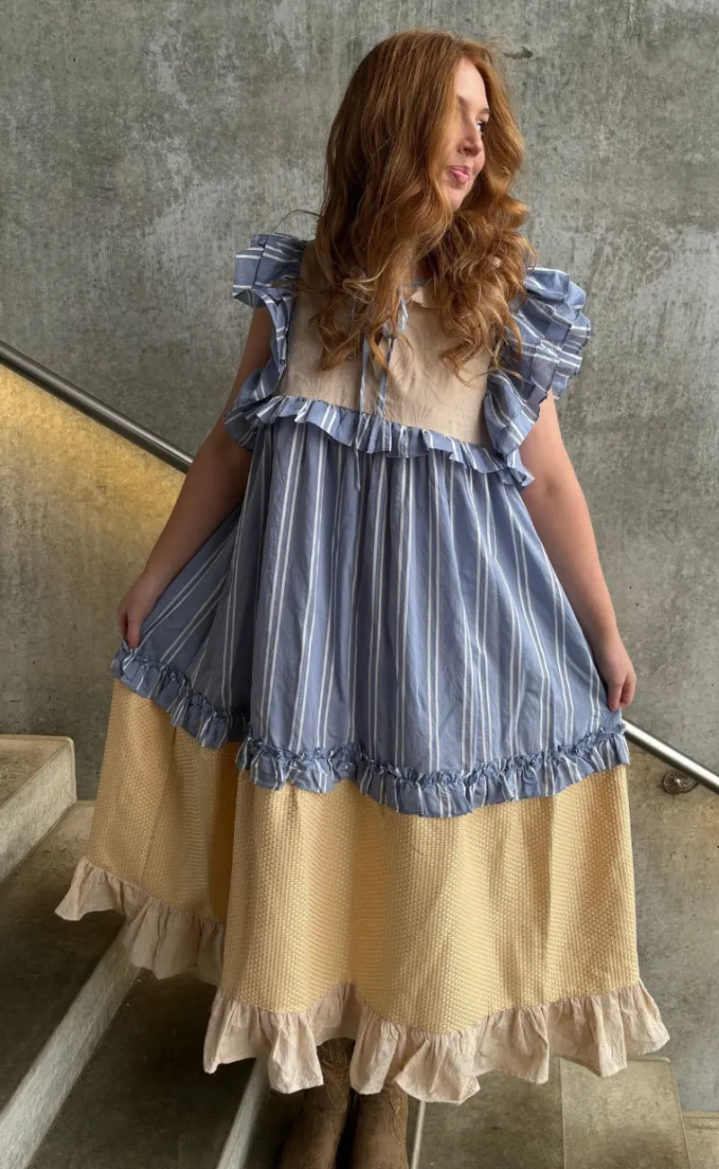 Overdelen har blå og hvide striber med små flæser ved skuldrene og under brystet, der giver et romantisk og let look. Nederdelen er i beigefarvet, tekstureret stof med en bred flæsekant, som får kjolen til at falde flot og føles ekstra elegant.