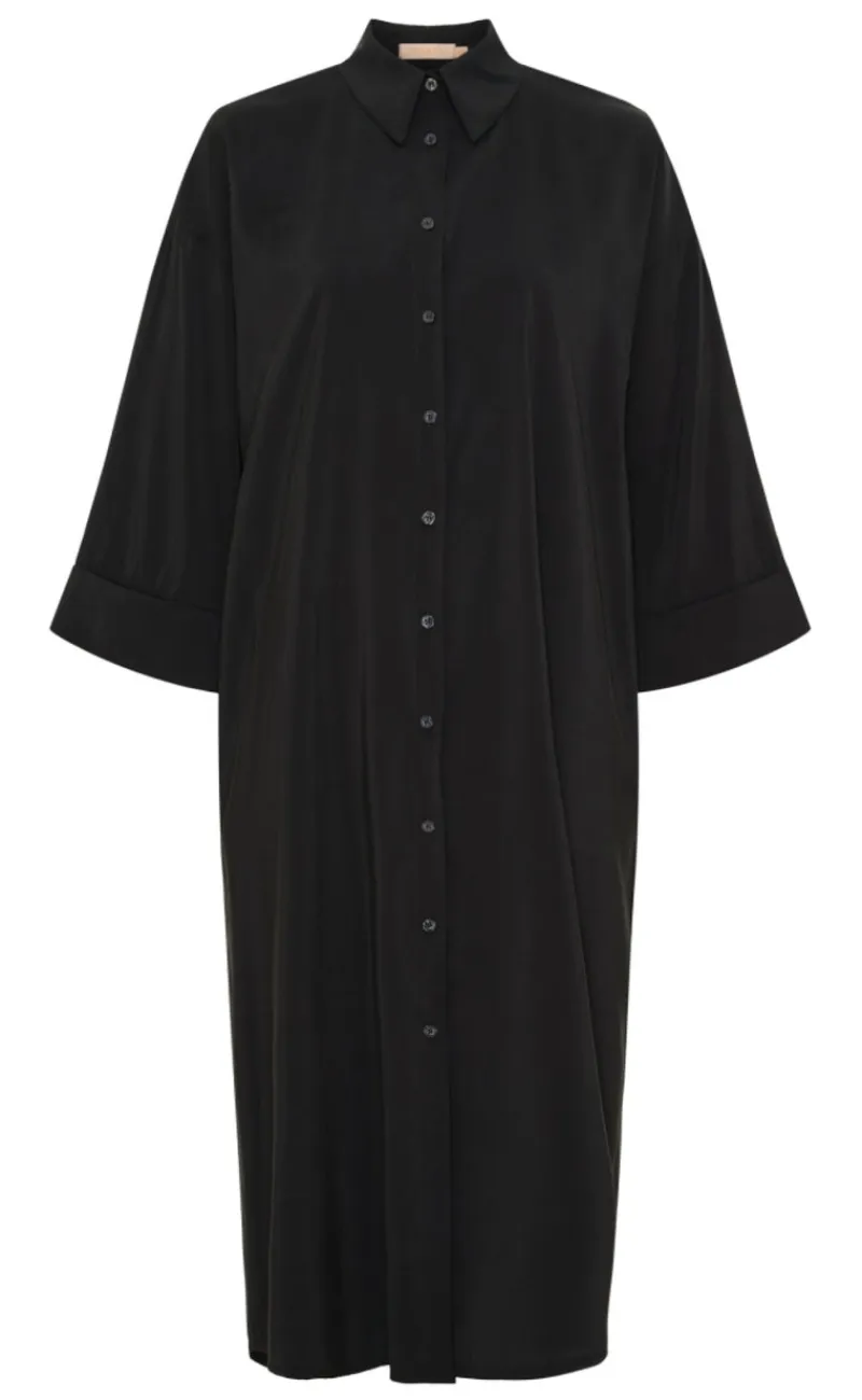 Simpel kjole fra Marta Du Chateau i sort, som er gennemknappet og har lange ærmer.