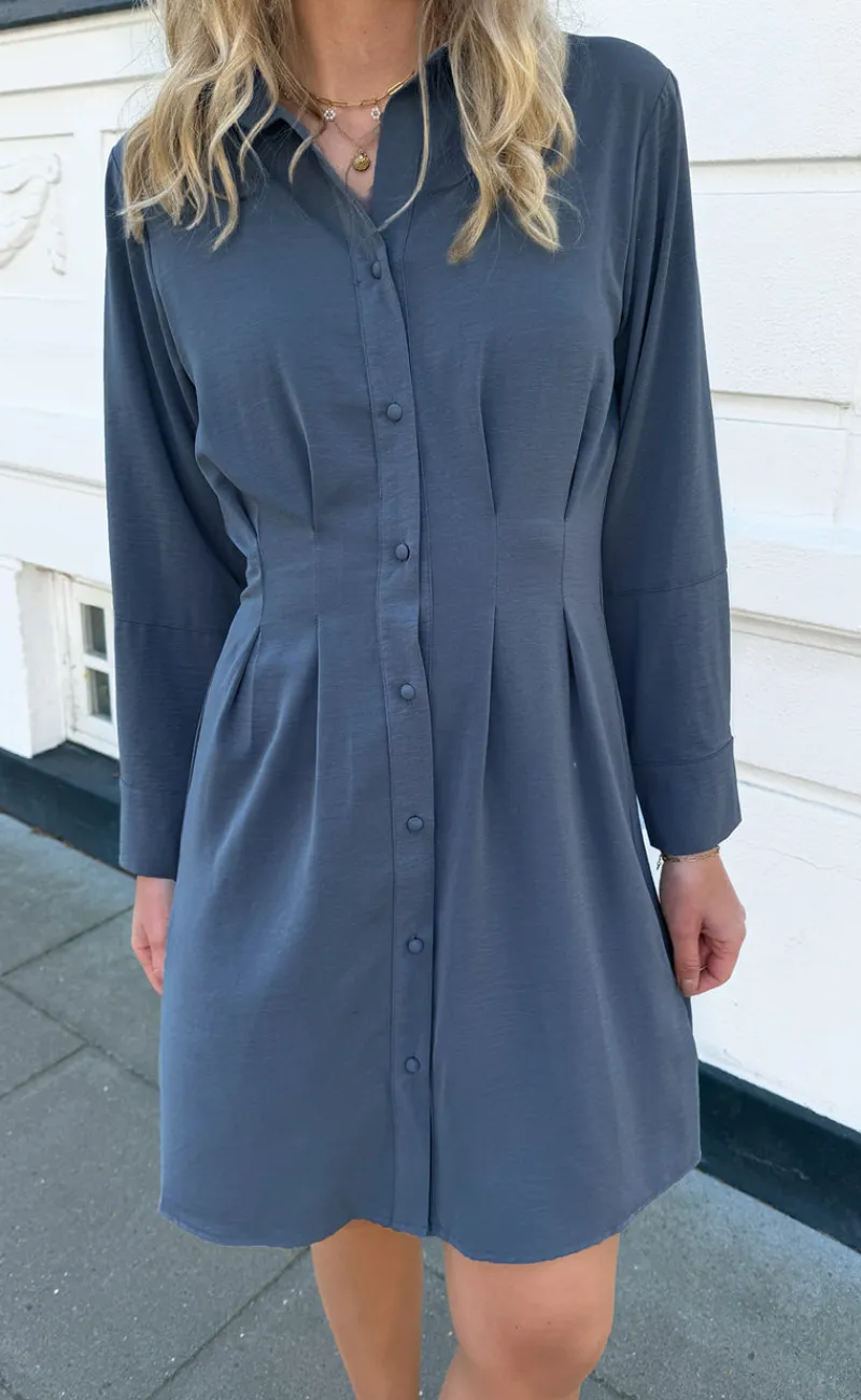Kjolen har lange ærmer, åbnes med knapper fortil og har de fineste syningsdetaljer i siderne, så kjolen får et feminint udtryk.