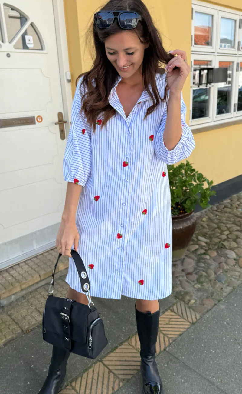 Den yndigste kjole fra INA Copenhagen i et blå og hvid stribet print, med små broderede jordbår.