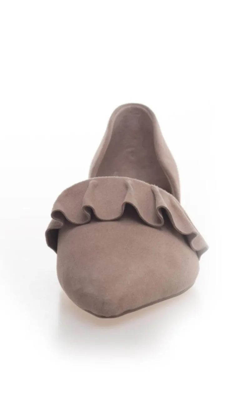 Skoene har en spids snudesløje og fine flæsedetaljer.